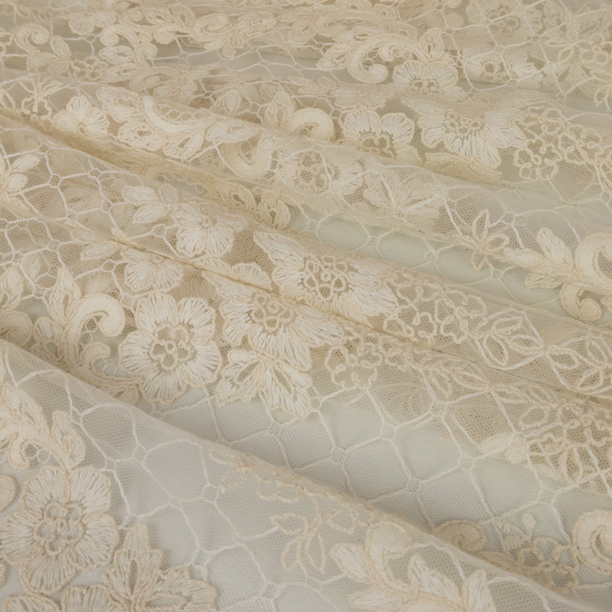 Lula Embroidered Lace Designer End – Vintage Cream. A vintage-style lace in soft cream, embroidered on a sheer mesh base with a romantic floral design. Finished with a scalloped edge, this fabric is perfect for dresses, blouses, overlays, and bridal-inspired pieces. Sourced as a true designer end, available in limited quantities.