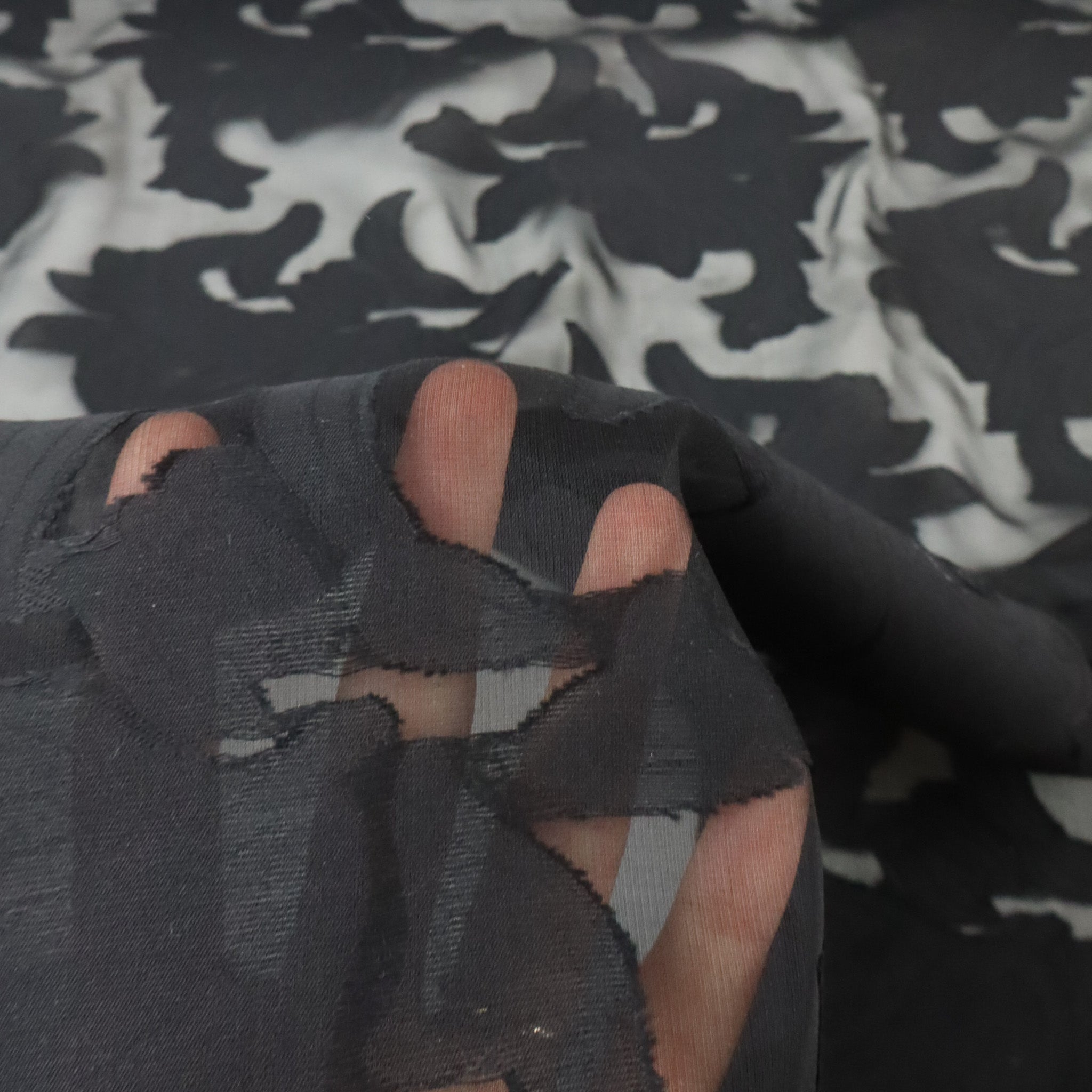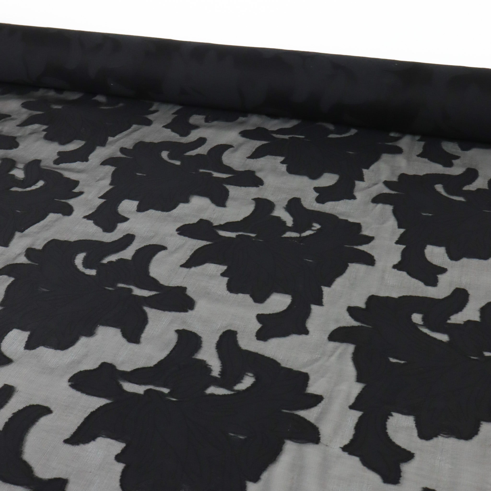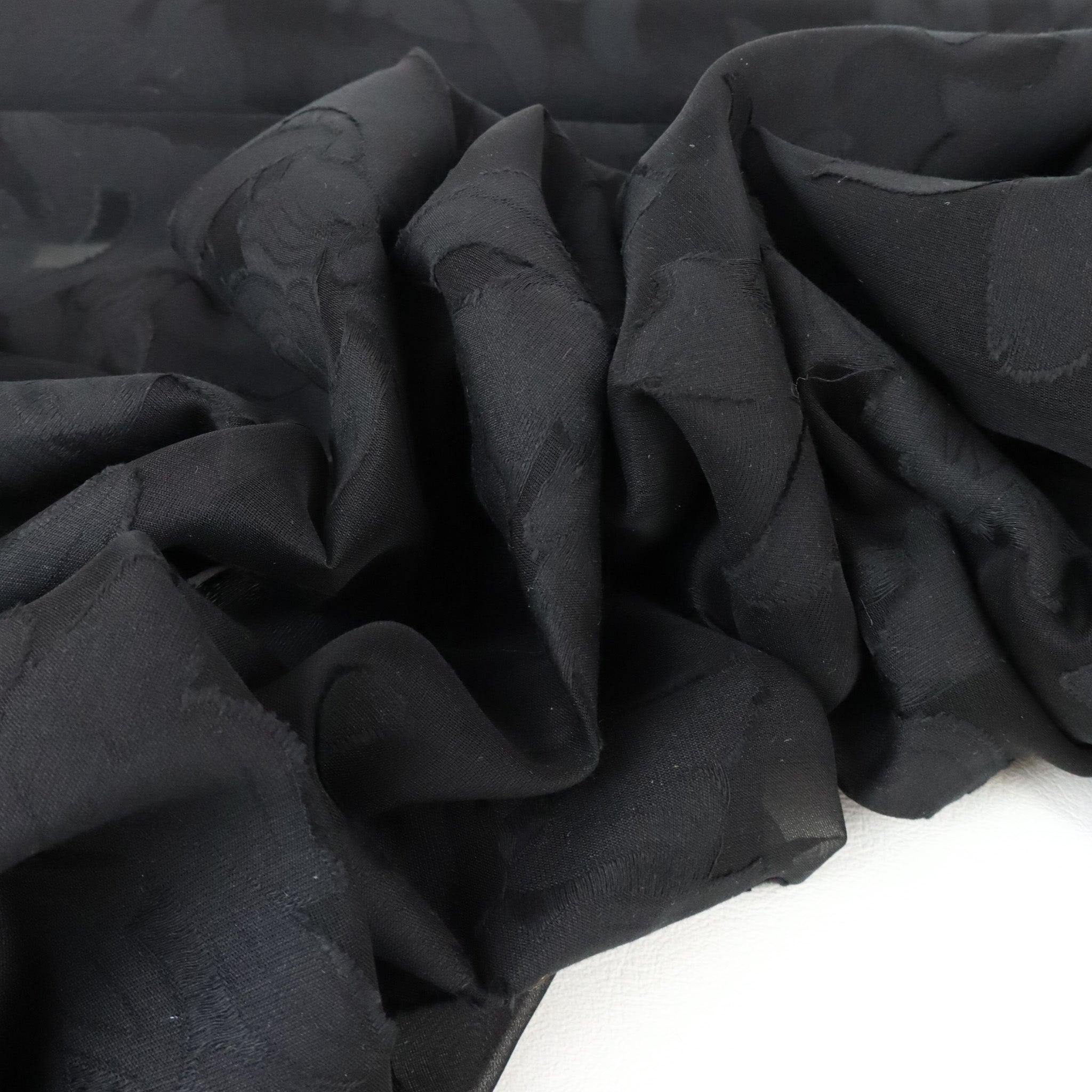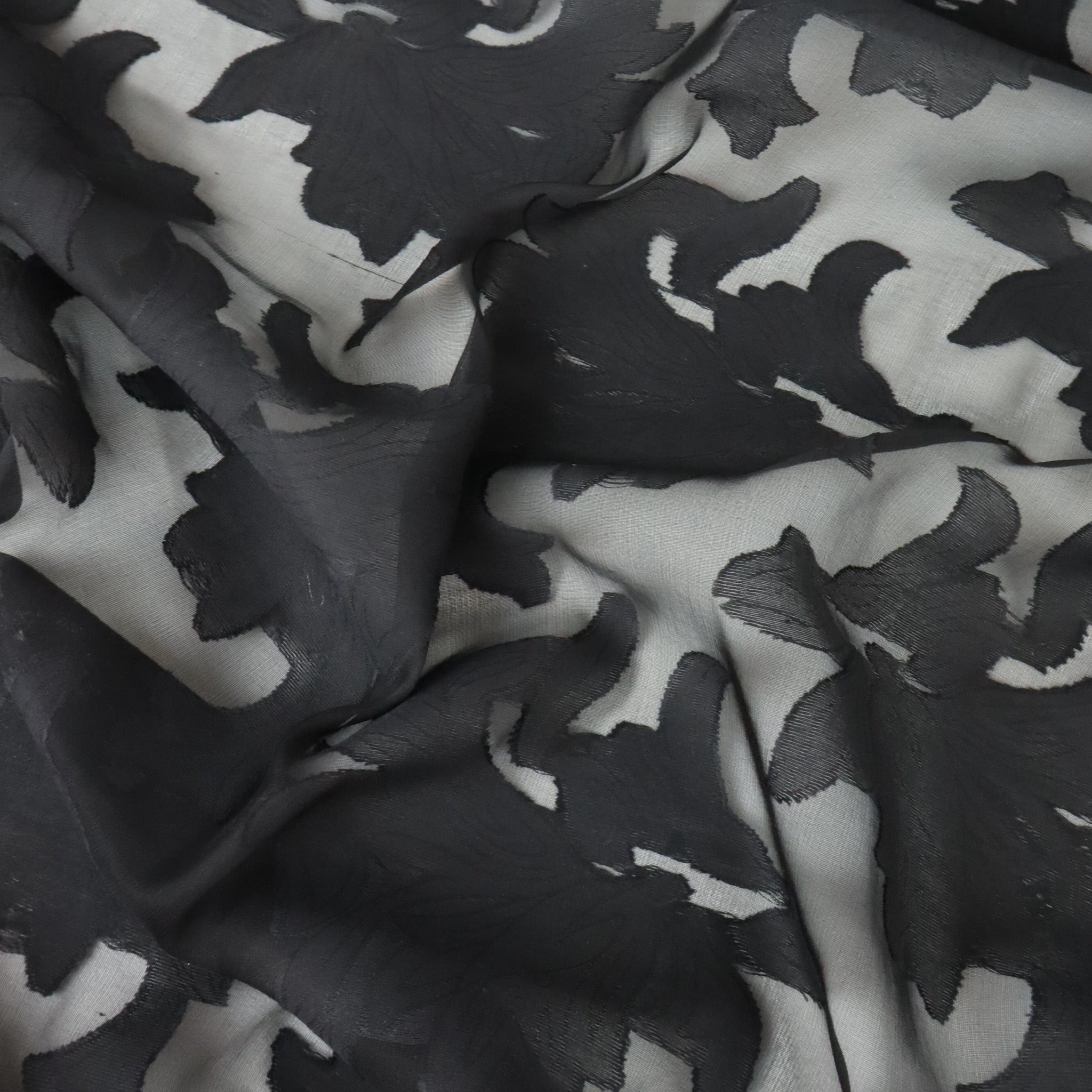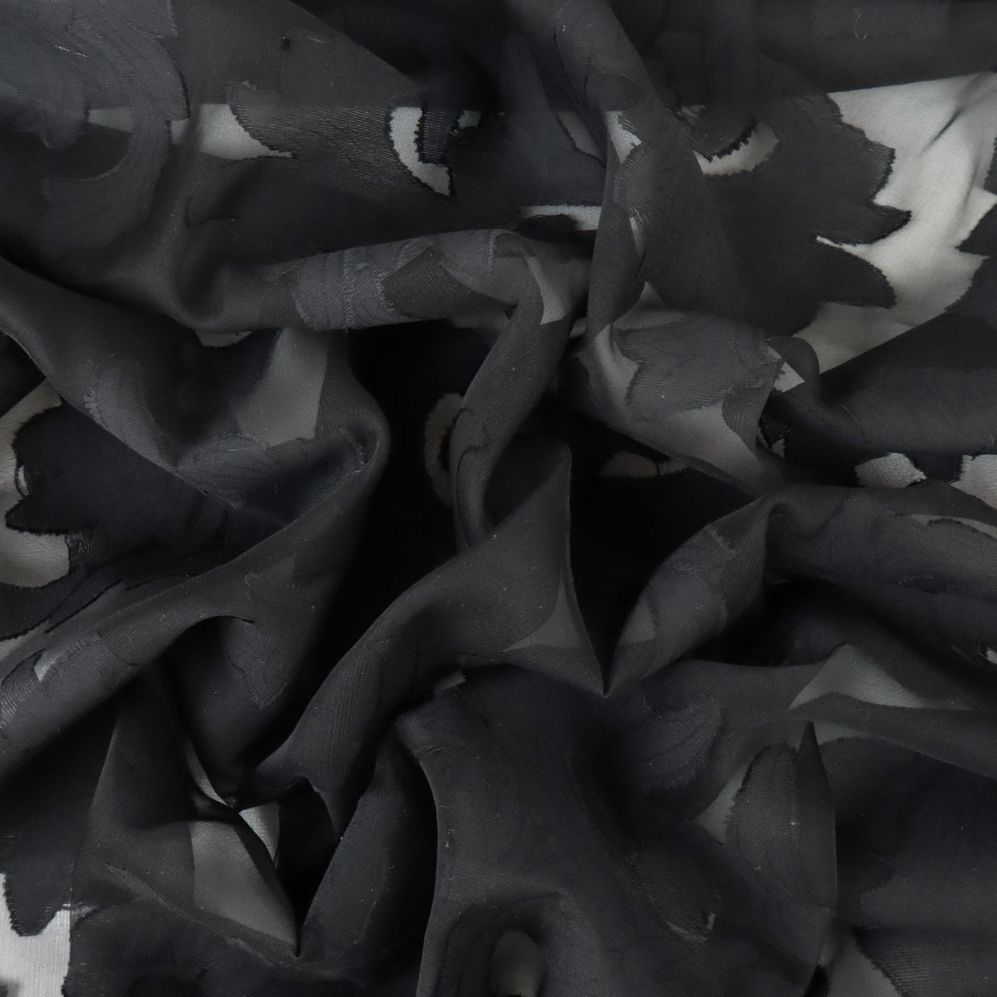 Rockaway Silk Viscose Designer End – Black Burnout. A delicate silk-viscose burnout with a soft floral design on a sheer black chiffon base. Lightweight and airy, this fabric is perfect for evening blouses, dresses, and elegant layered looks. Sourced as a true designer end, available only in limited quantities.