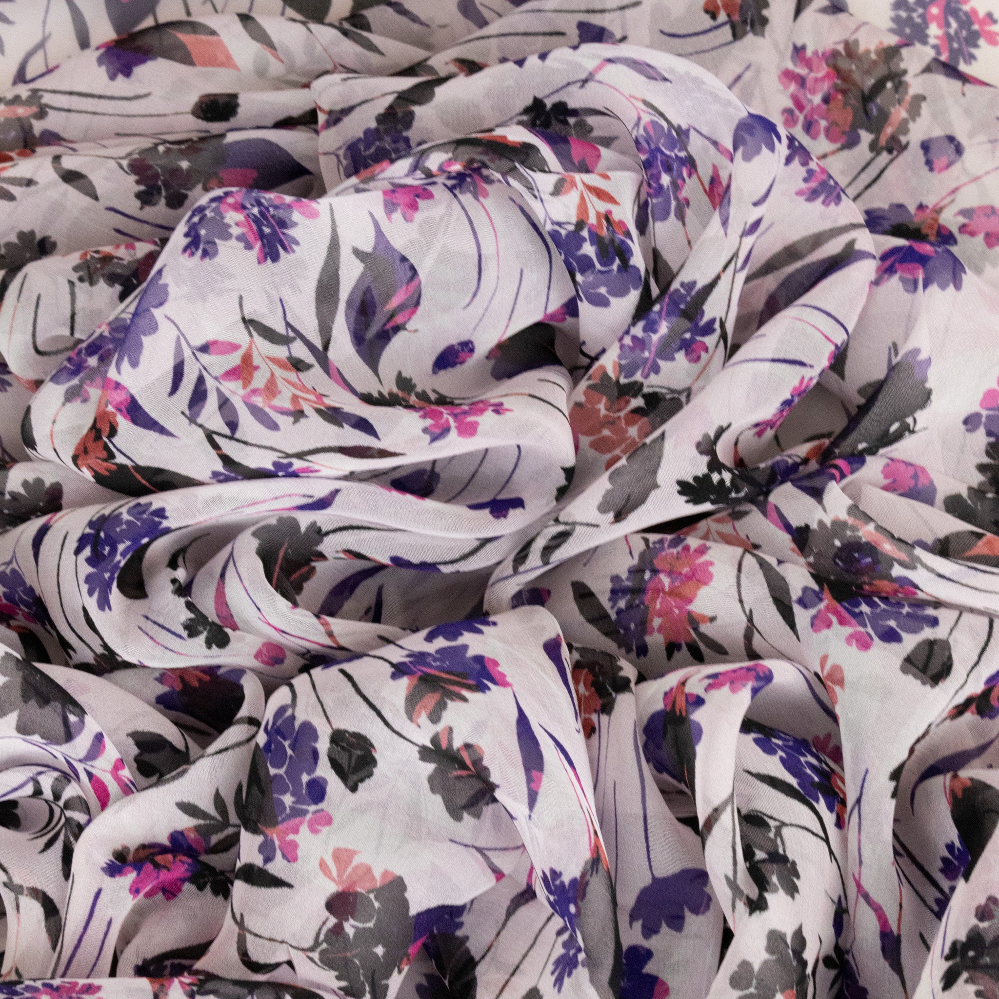 Silk Printed Chiffon Deadstock - Multi Floral. Lightweight, sheer, and beautifully fluid, this pure silk printed chiffon drapes effortlessly for floaty blouses, dresses, and gathered skirts. A rare deadstock find and an exceptional opportunity to add a touch of luxury to your handmade wardrobe.