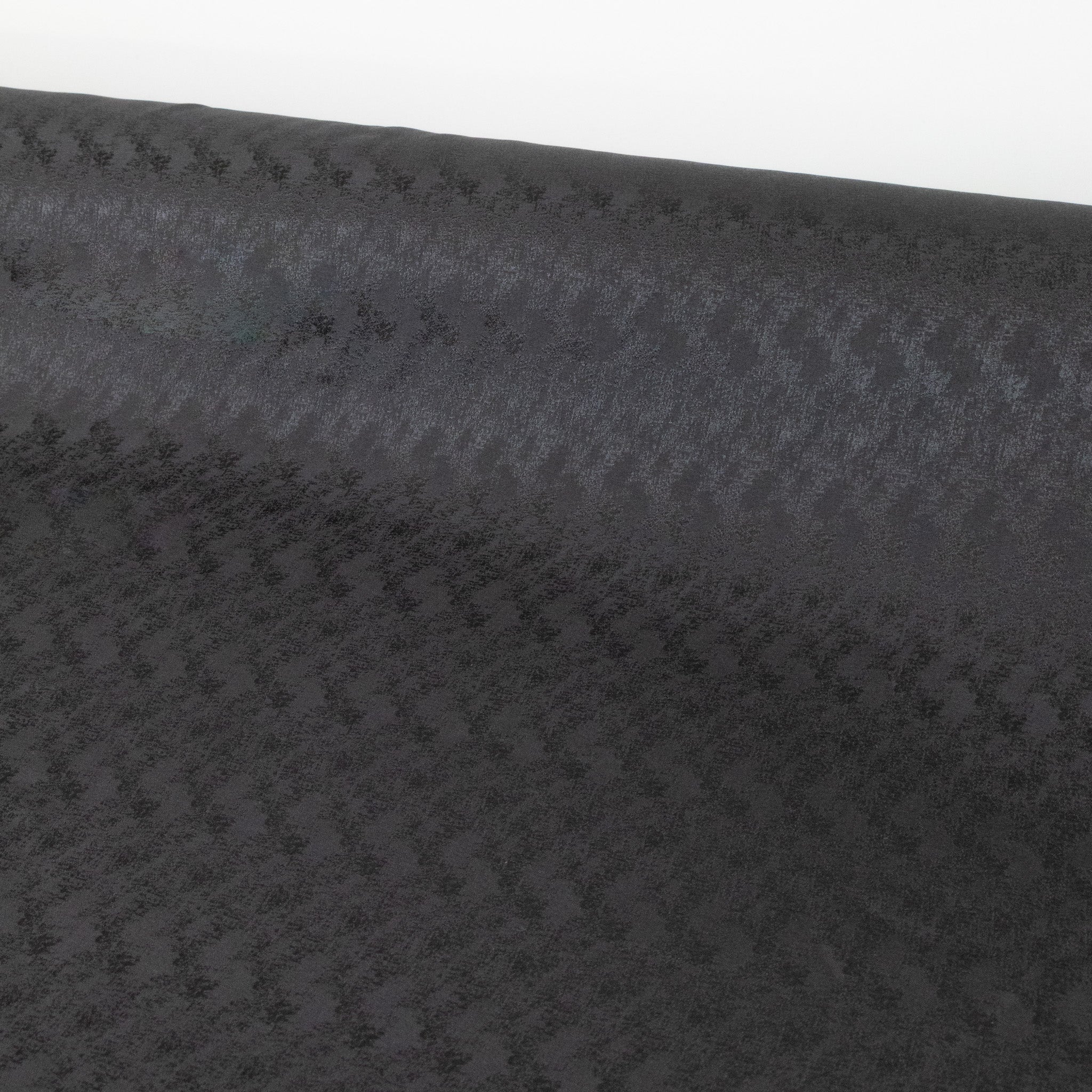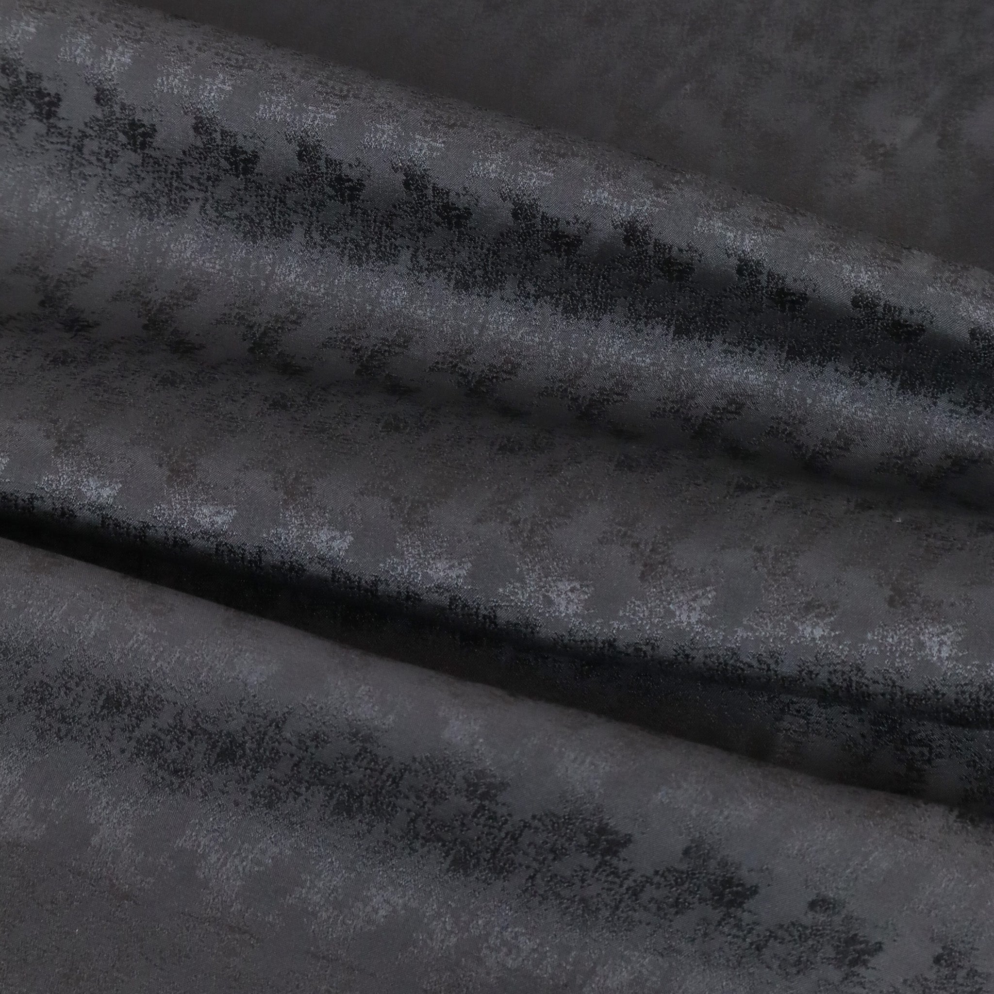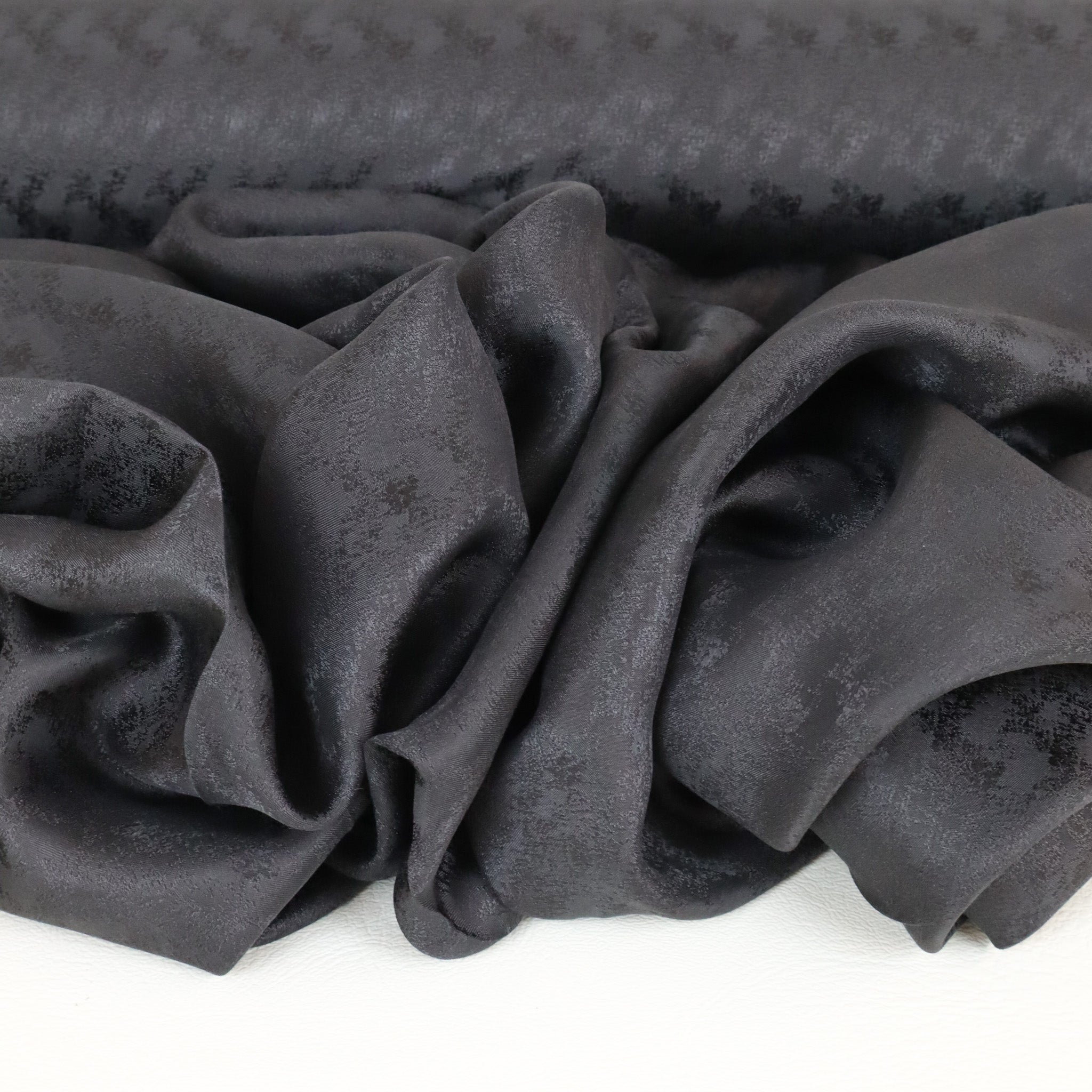 Skyline Silk Satin Designer End – Granite Charcoal Jacquard. A refined silk satin in a deep granite charcoal grey, woven with an abstract herringbone jacquard. Smooth, lustrous, and softly structured, this fabric is ideal for elegant dresses, skirts, and statement tailoring. Sourced as a true designer end, available only in limited quantities.