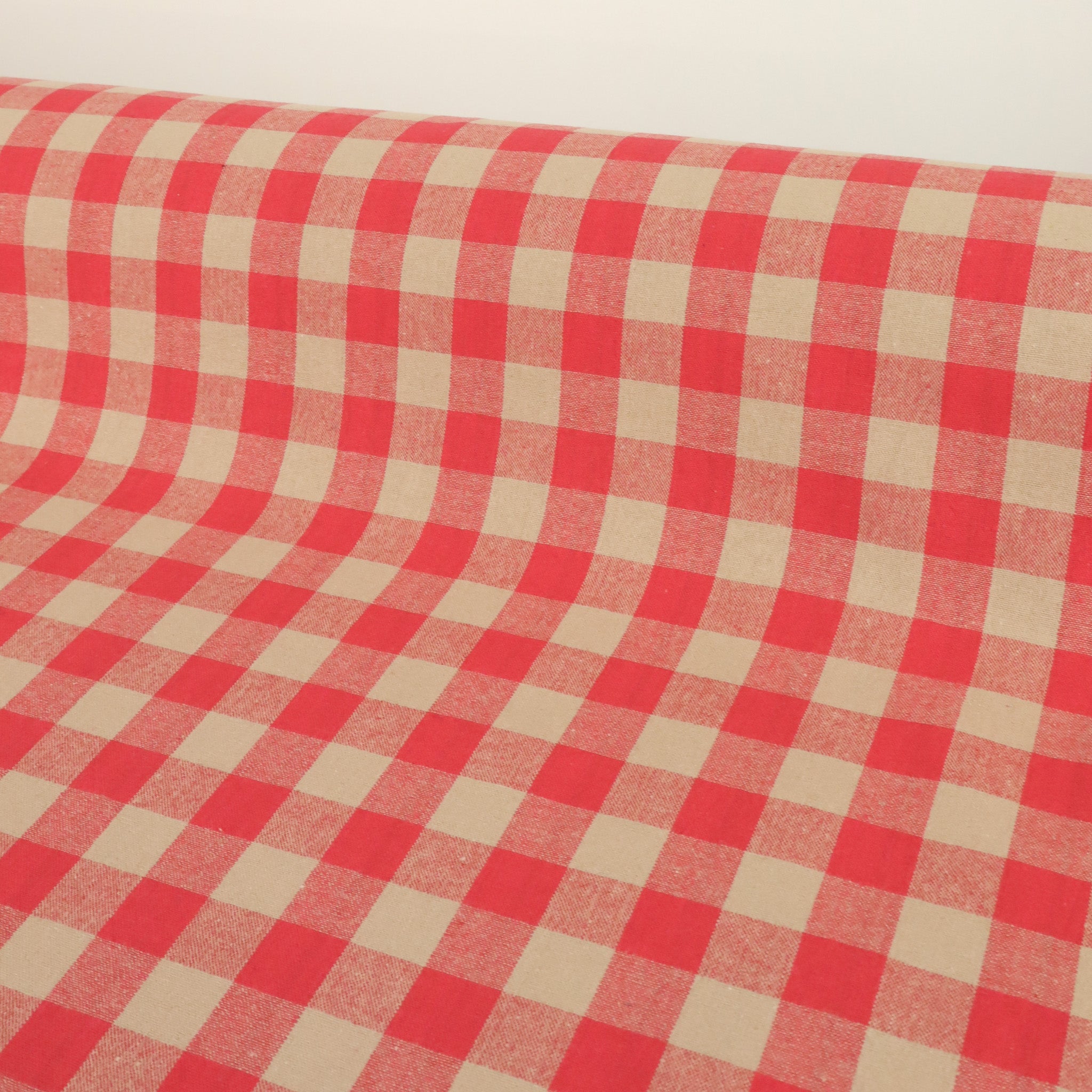 Yarn Dyed Washed Cotton Gingham in Cherry. Similar to our popular yarn-dyed gingham, this cotton check has been pre-washed at the mill for a soft, ready-to-use handle and it’s pre-shrunk for added convenience. Featuring a mid-scale gingham in cherry pinky red and beige tones, it has a crisp, cheerful look perfect for warmer days. Breathable with a lightly structured drape, this woven cotton offers breezy comfort with durability making it ideal for layered skirts, dresses, shirts, tops, pants, and jumpsuits. Each check square measures approximately 16mm.