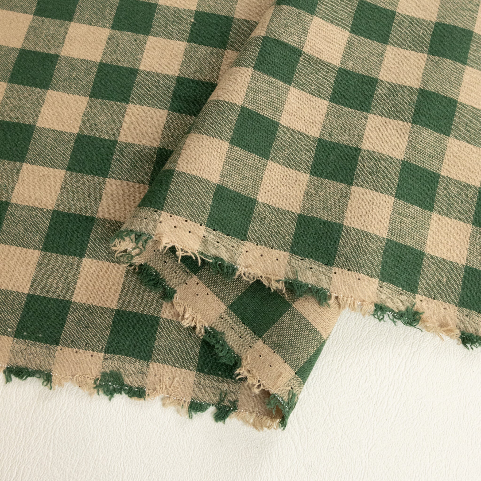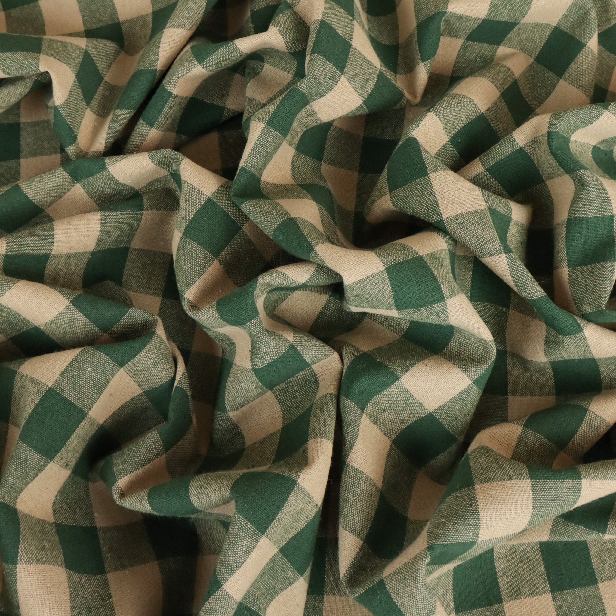 Yarn Dyed Washed Cotton Gingham in Forest. Similar to our popular classic yarn-dyed gingham, this cotton check has been pre-washed at the mill for a soft, ready-to-use handle and it’s pre-shrunk for added convenience. Featuring a mid-scale gingham in forest green and beige tones, it has a crisp, cheerful look perfect for warmer days. Breathable with a lightly structured drape, this woven cotton offers breezy comfort with durability making it ideal for layered skirts, dresses, shirts, tops, pants, and jumpsuits. Each check square measures approximately 16mm.