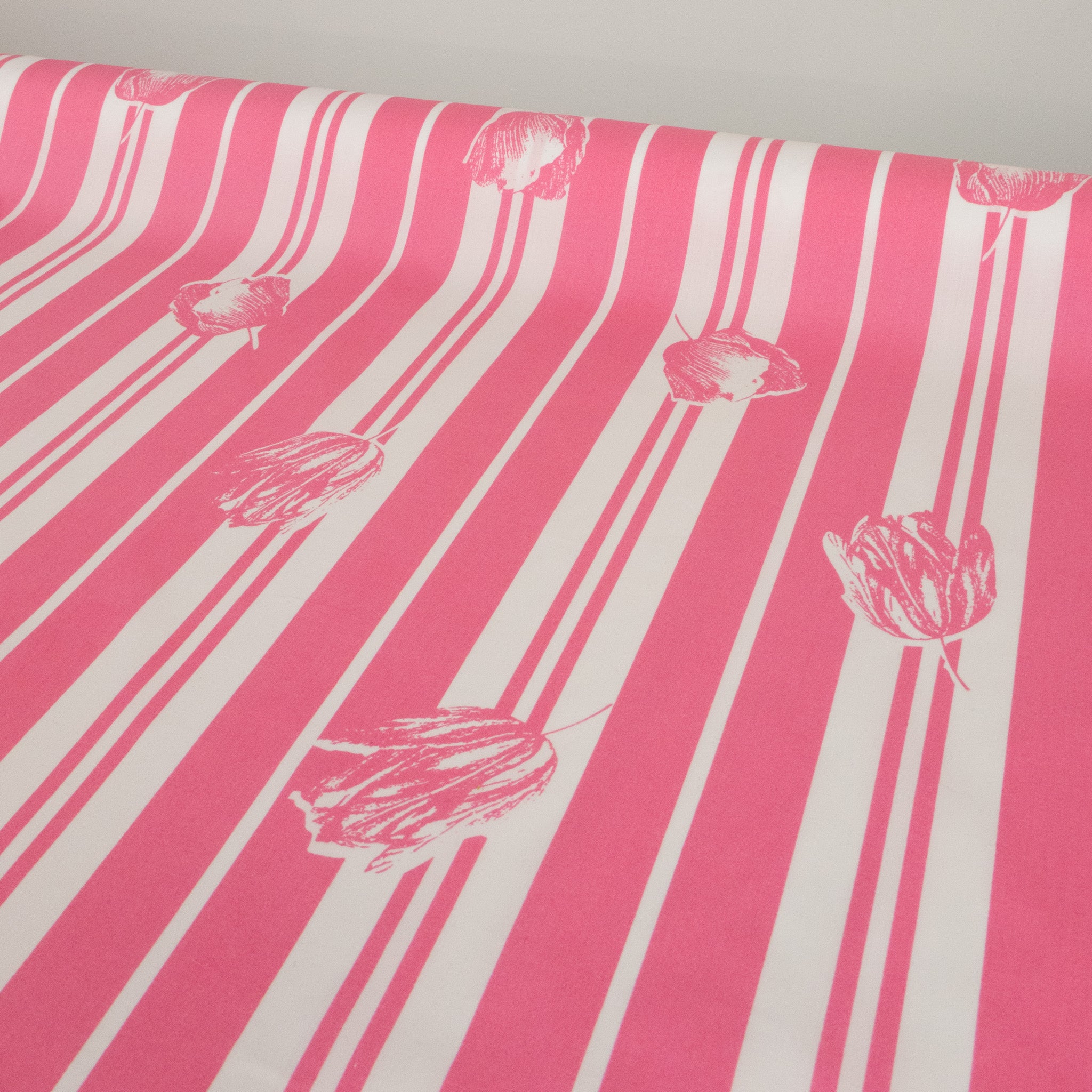 Bold Stripe Floral Cotton Poplin Print in Hot Pink. A crisp, lightweight cotton poplin featuring a bold floral stripe print in vibrant hot pink. Smooth and breathable with a structured drape - perfect for shirts, shorts, or dresses that make a statement.