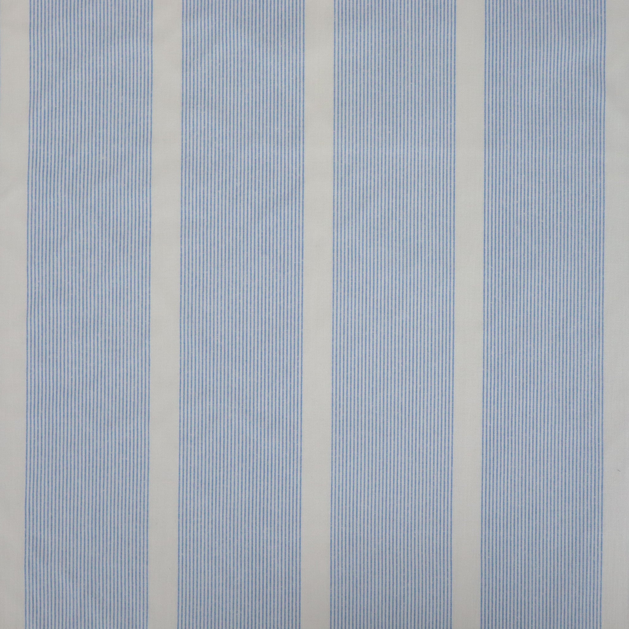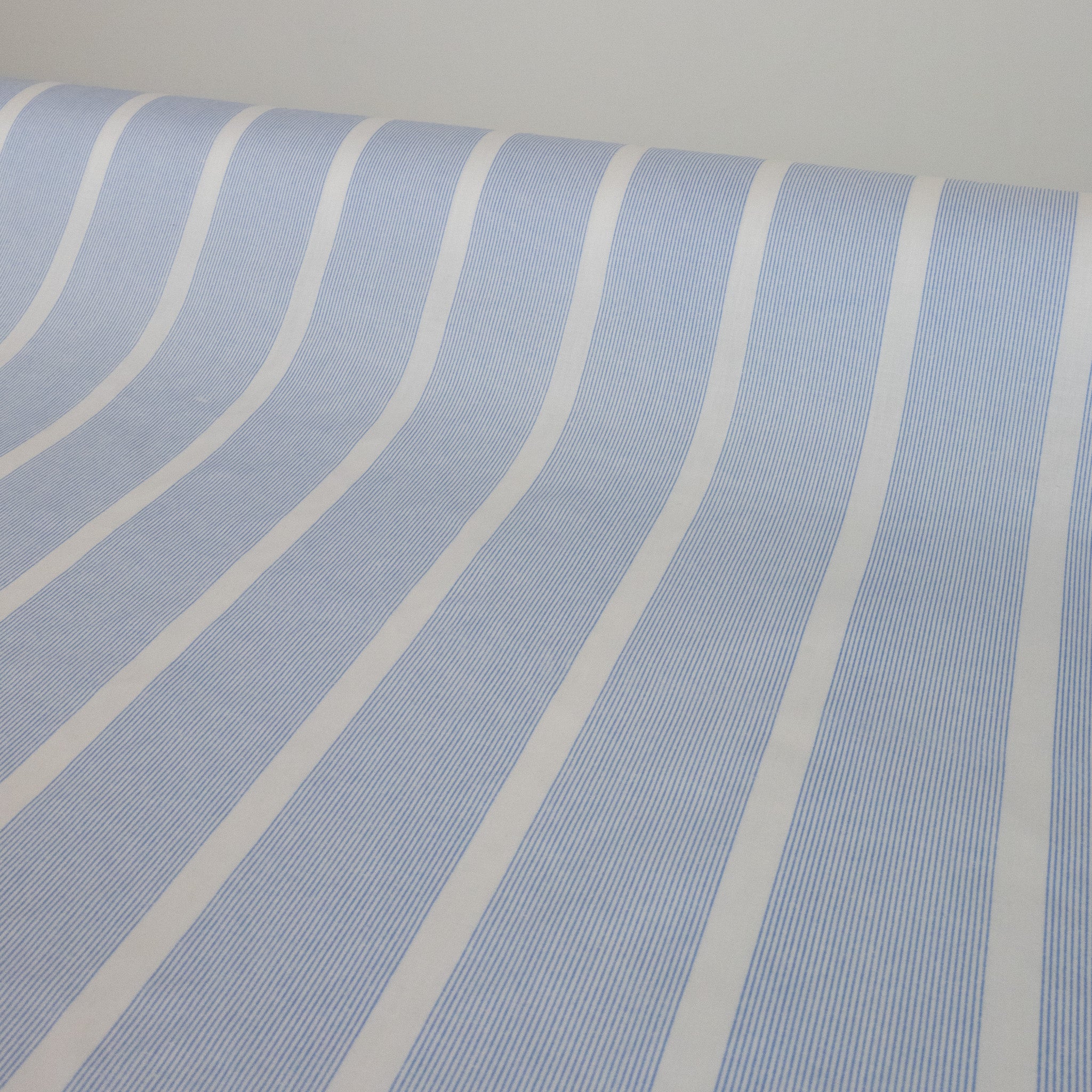Cotton Stripe Print Deadstock - Cornflower White. A midweight washed cotton with a clean stripe design and a soft, lived-in feel. Versatile and easy to sew, perfect for shirts, shorts, or a matching top and pant set.