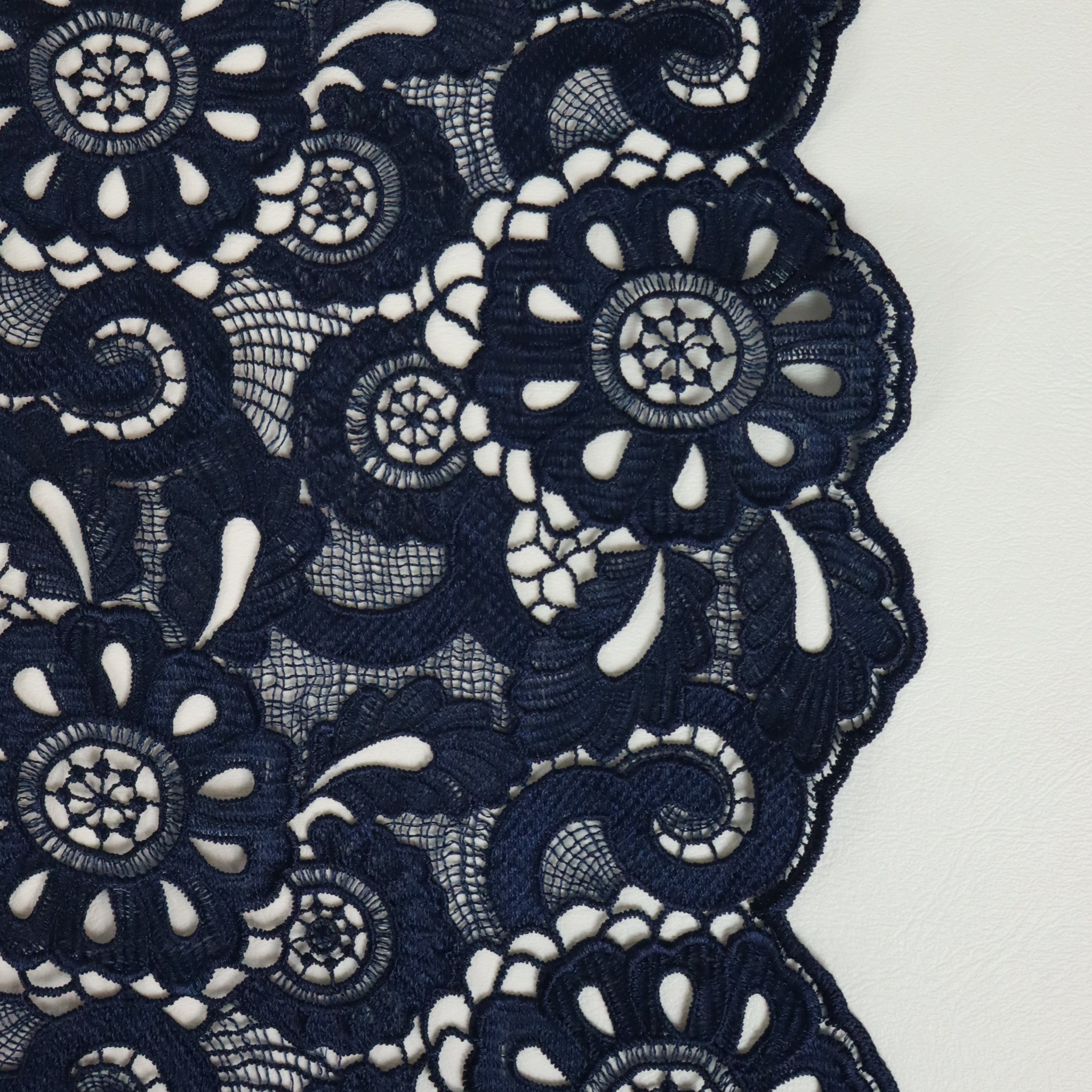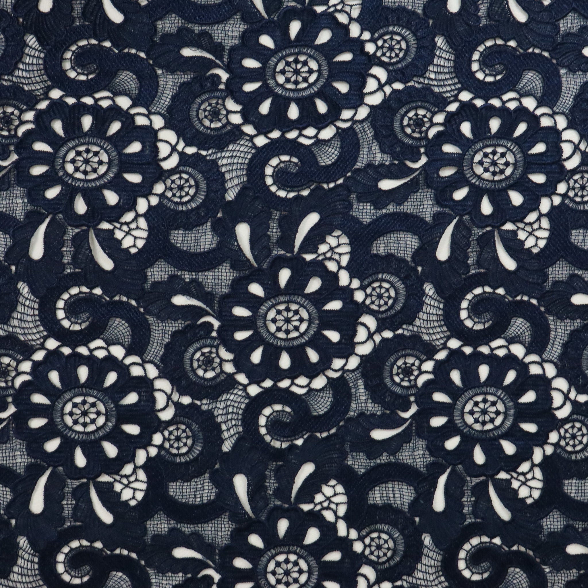 Rich navy blue sets the stage for this guipure-style lace, woven with an elaborate floral pattern. With its striking texture and elegance, it’s ideal for gowns, cocktail dresses, or refined overlays. Cleared from the workrooms of a fashion house, this designer end is a rare treasure.