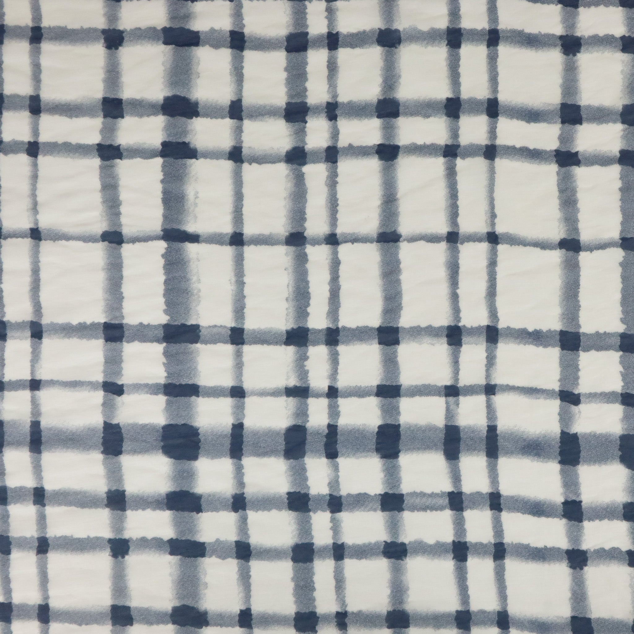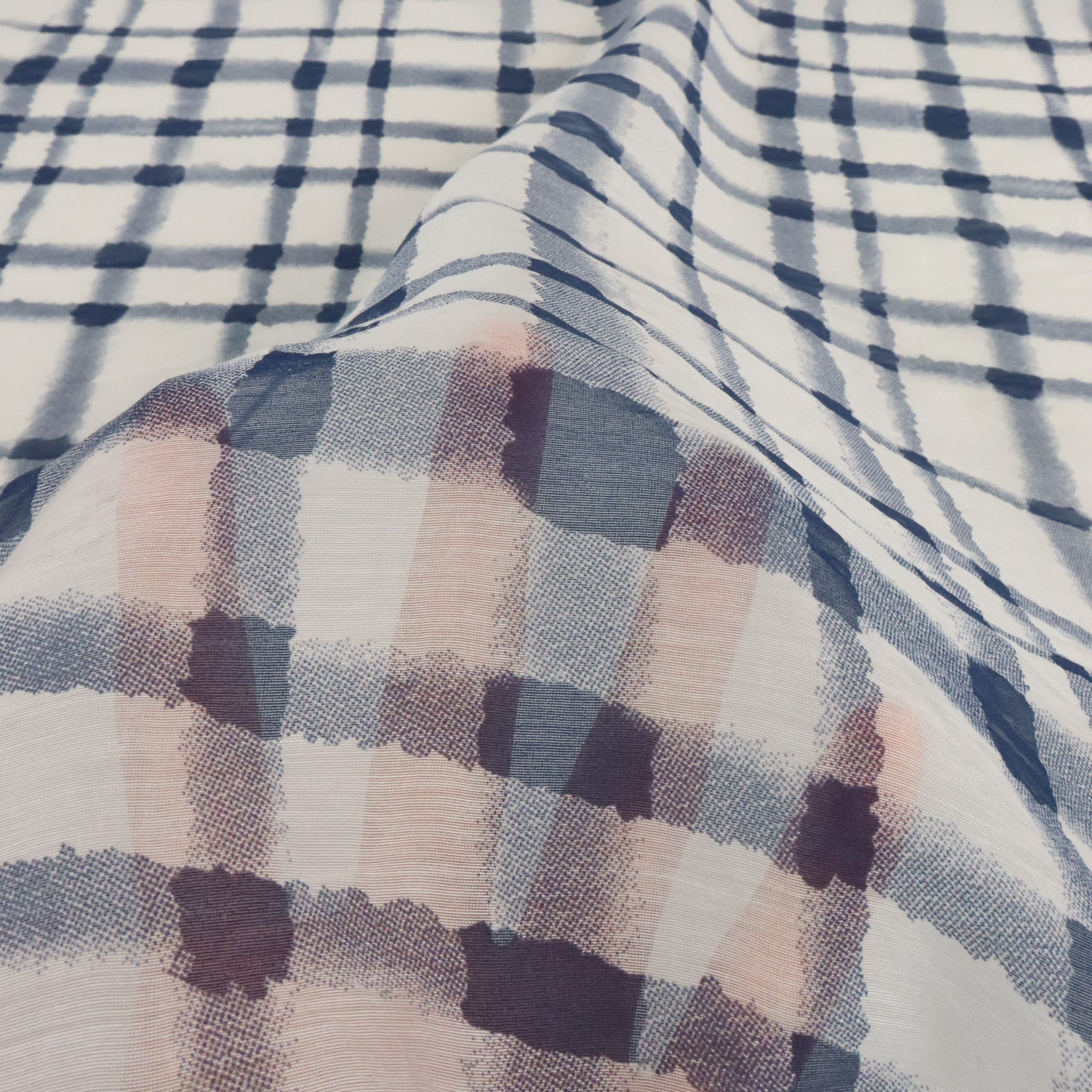 Tencel Nylon Abstract Check Print - Thistle Navy. A lightweight Tencel-nylon with a voile-like base, featuring an abstract check print. Smooth and airy with gentle drape, this fabric is ideal for blouses, dresses, and layering pieces. Due to the nylon content, a low iron is recommended if needed.
