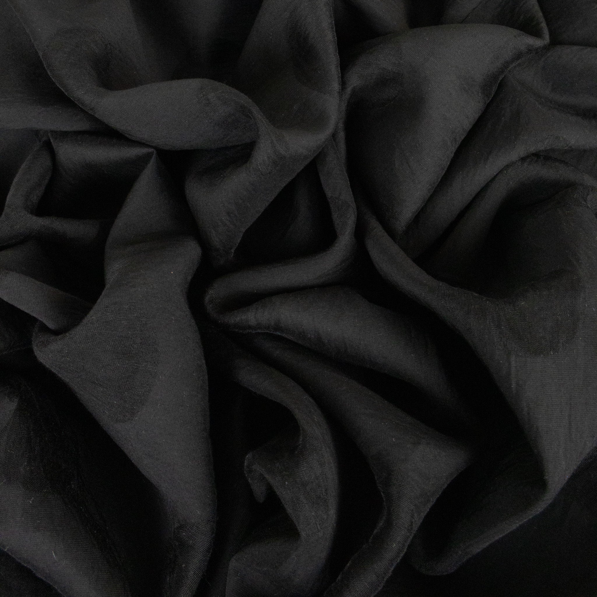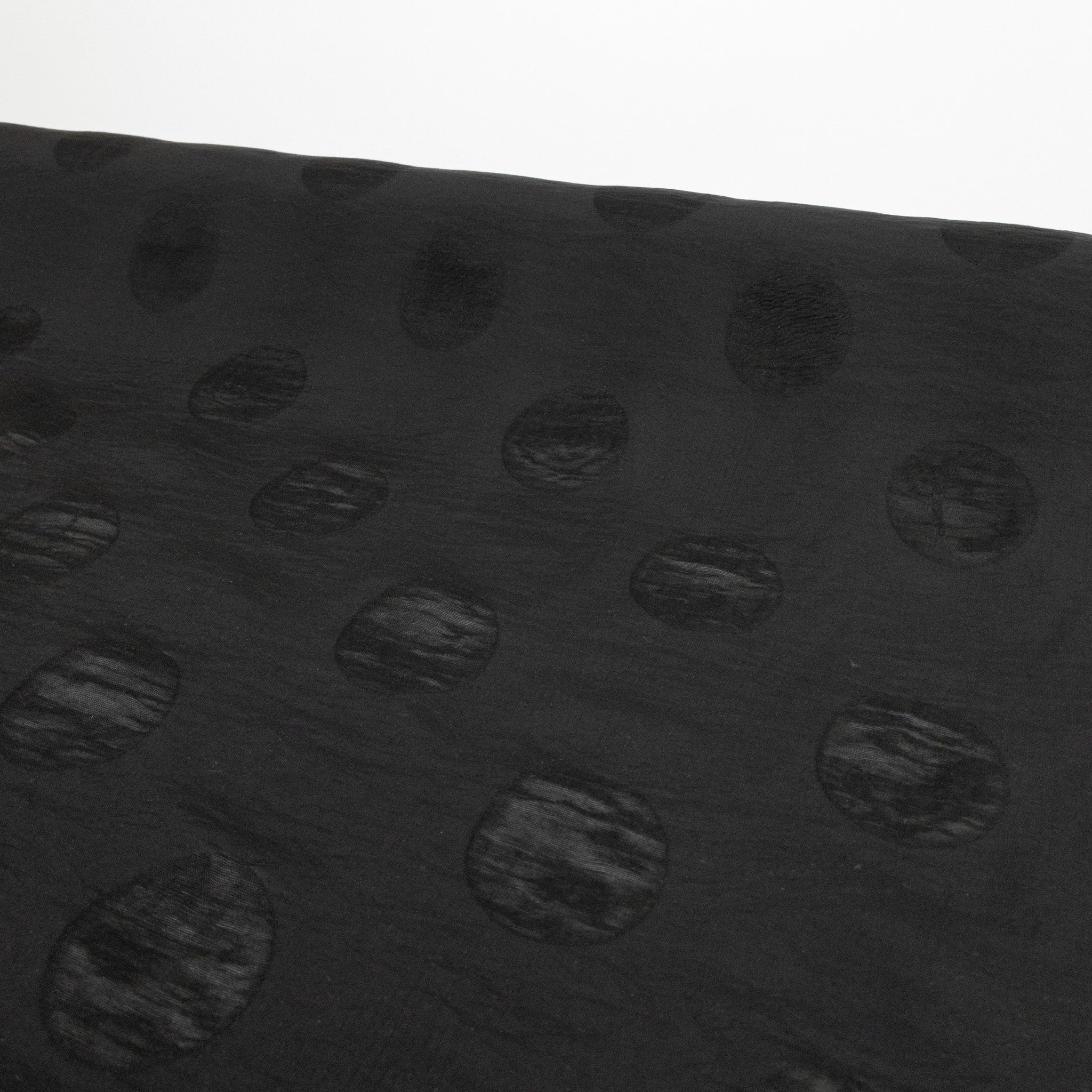 Tencel Nylon Jacquard Spot - Scofield Black. A lightweight Tencel-nylon with a voile-like base, featuring a delicate jacquard spot. Smooth, airy, and softly draping, this fabric is ideal for blouses, dresses, and layering pieces. Due to the nylon content, use a low iron if needed.