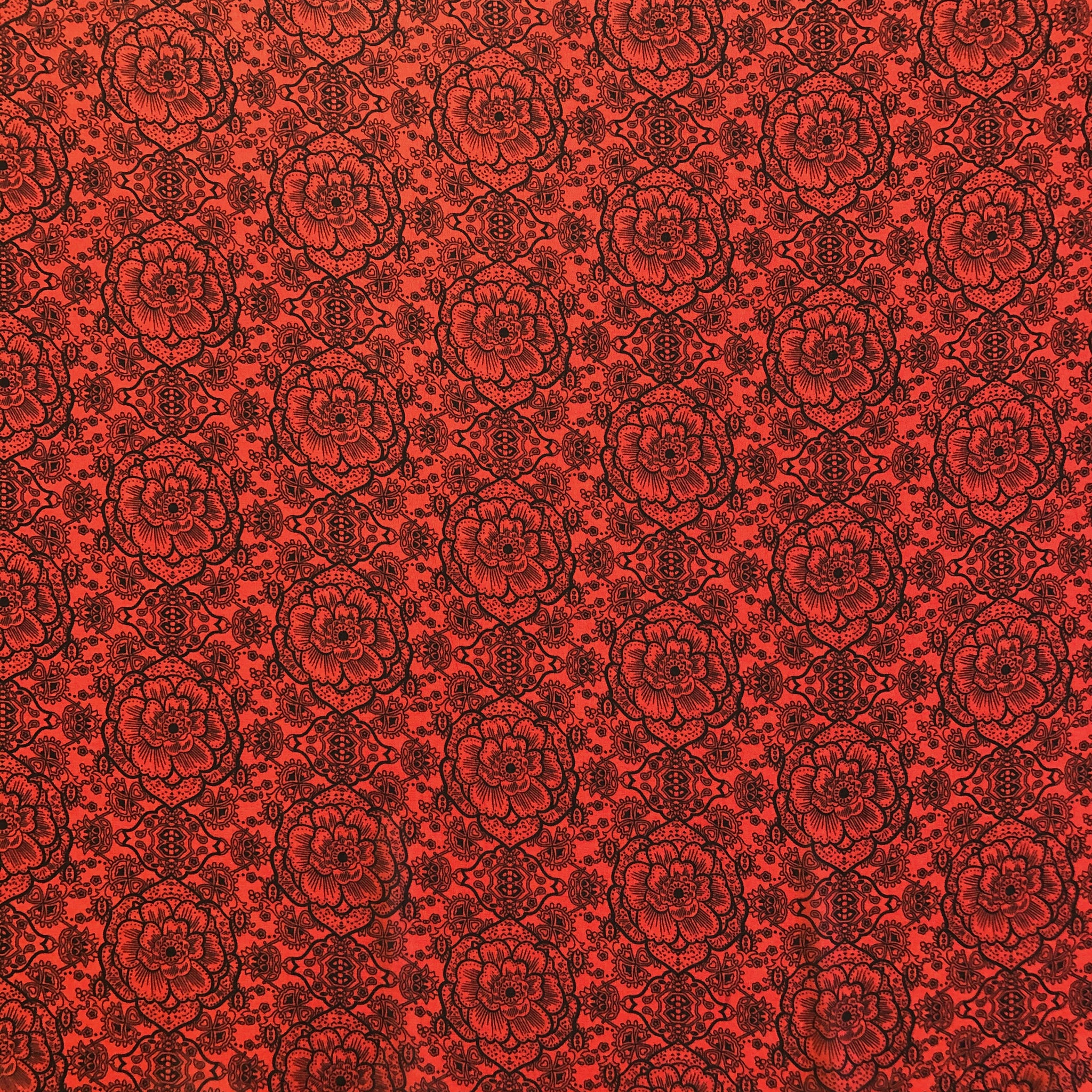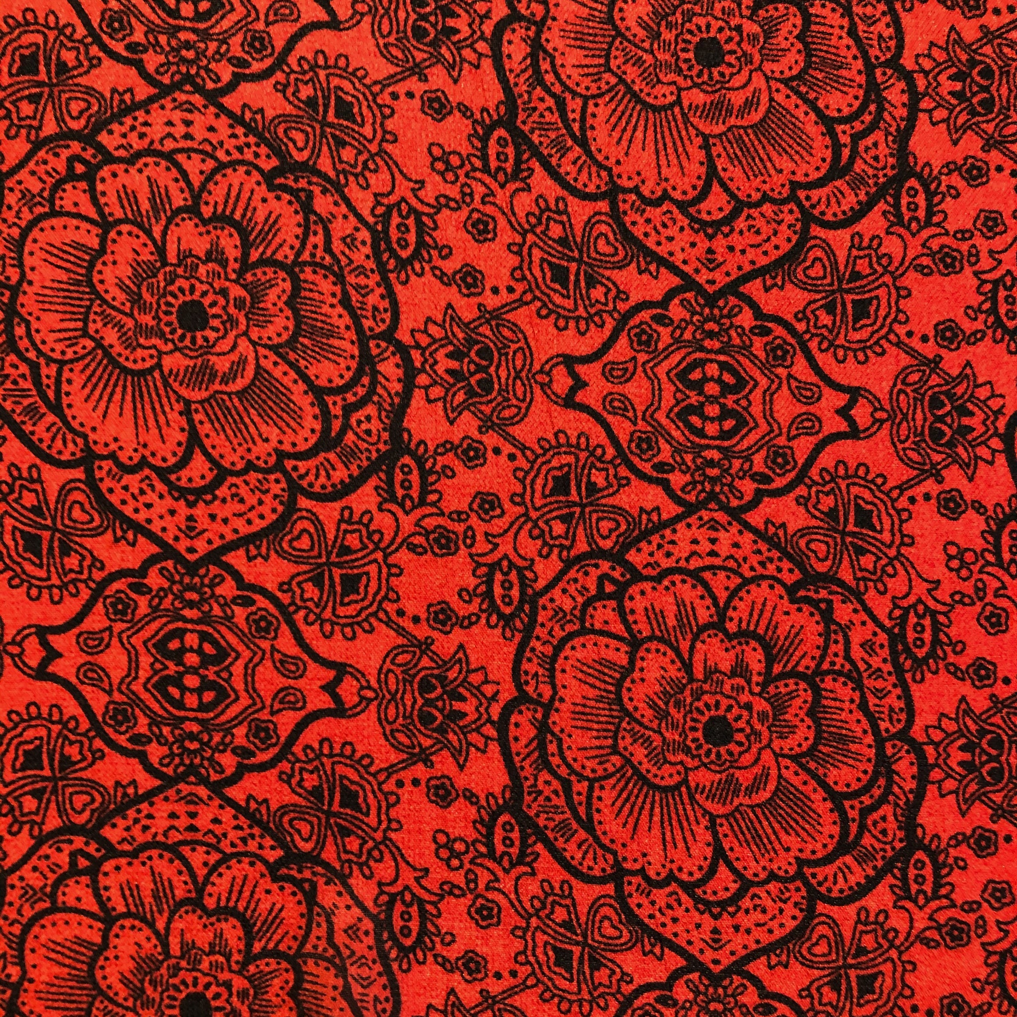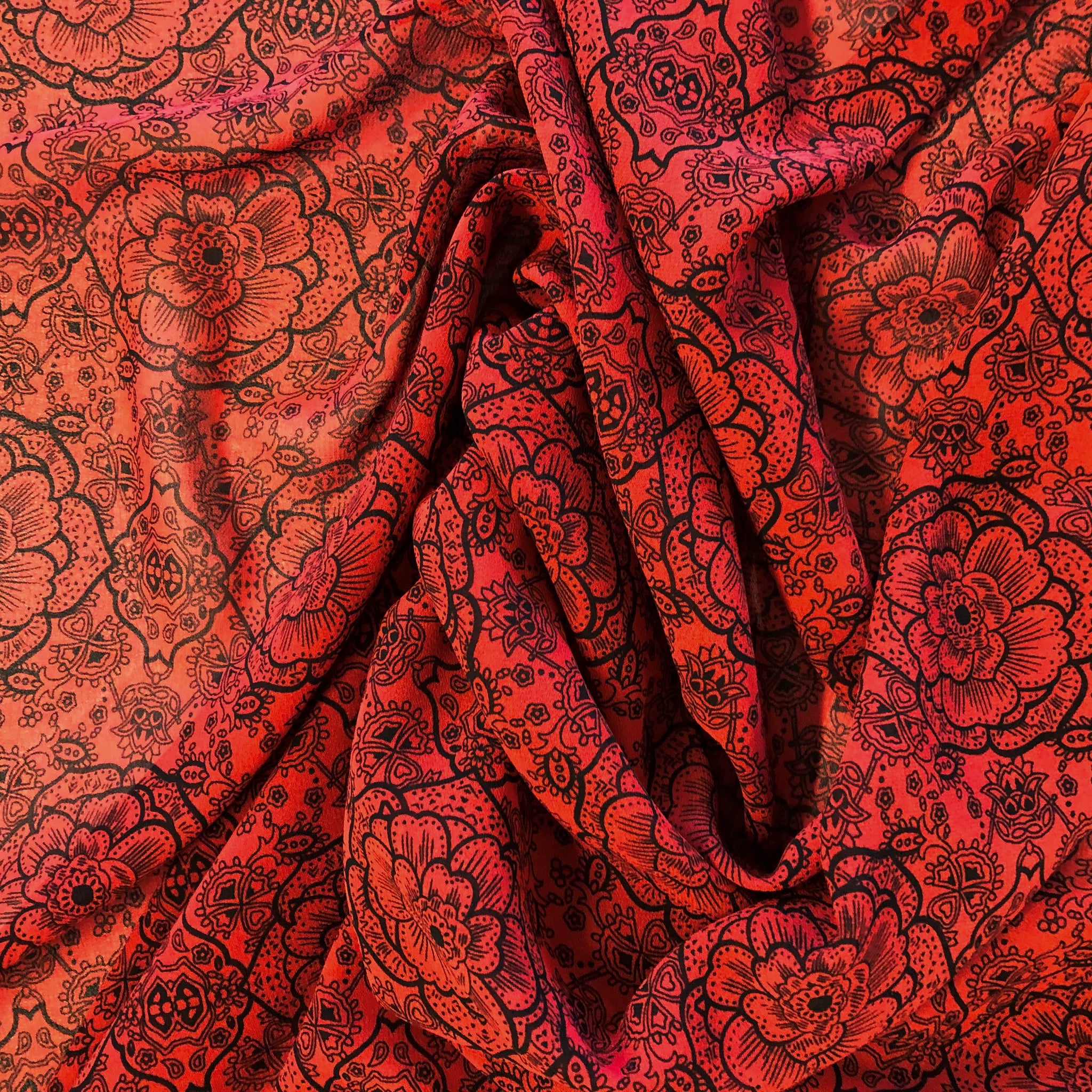Bohemian Crepe Georgette in Red. A lightweight crepe georgette featuring a bohemian-inspired geometric design. Soft with a fluid drape, perfect for flowing tops, tunics, and skirts.