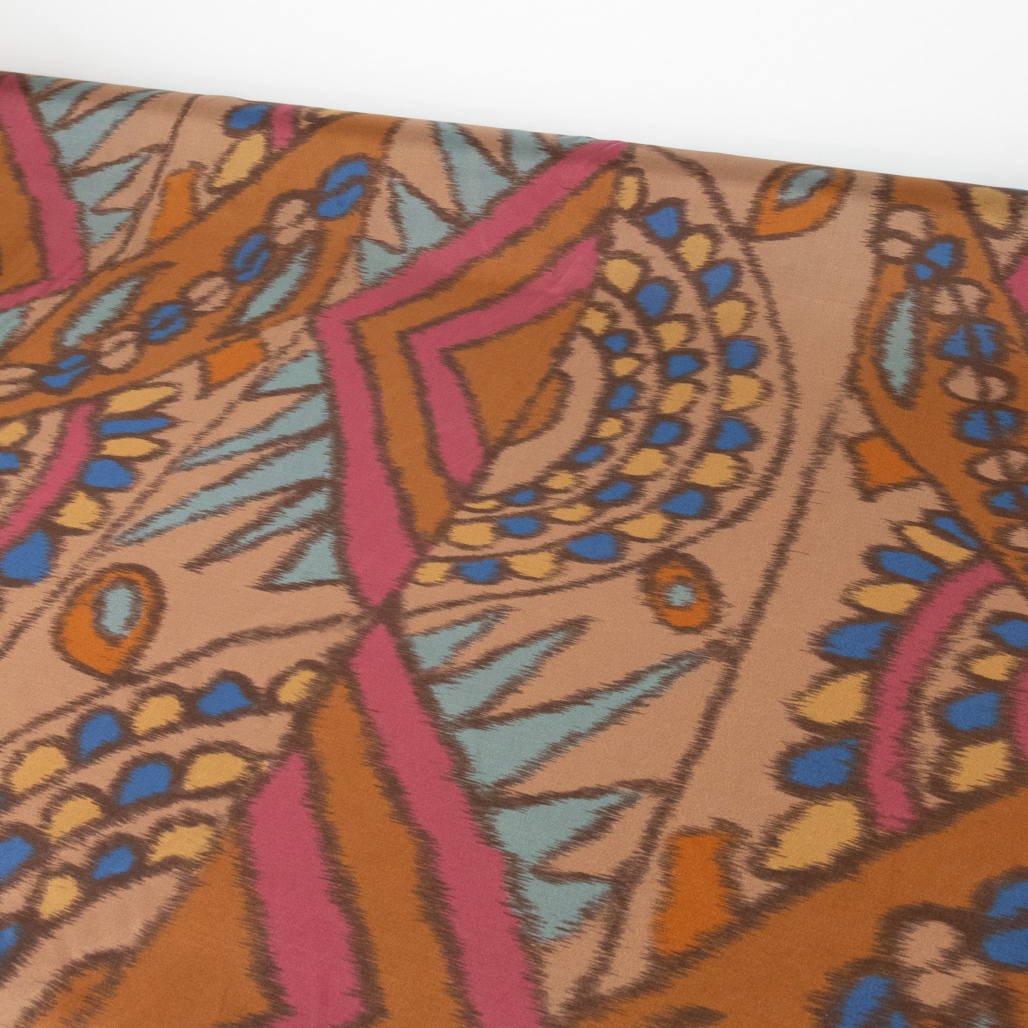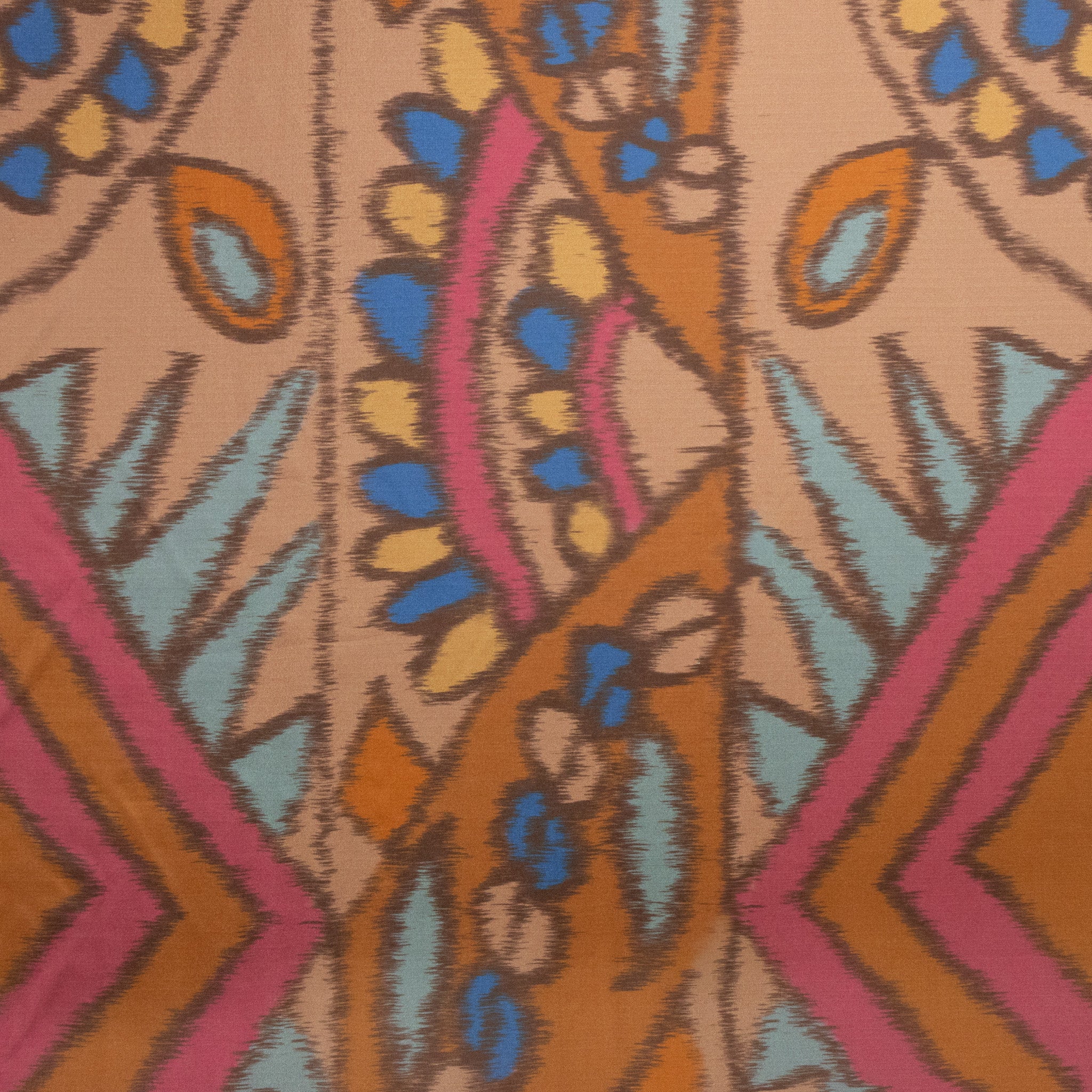 Brooklyn Silk Habotai Designer End – Tribal Abstract. A lightweight silk habotai printed with a bold tribal-inspired abstract in rose and rust, accented with touches of blue and pink. Smooth, soft, and fluid, this fabric is perfect for dresses, blouses, scarves, and statement layering. Sourced as a true designer end, available only in limited quantities.