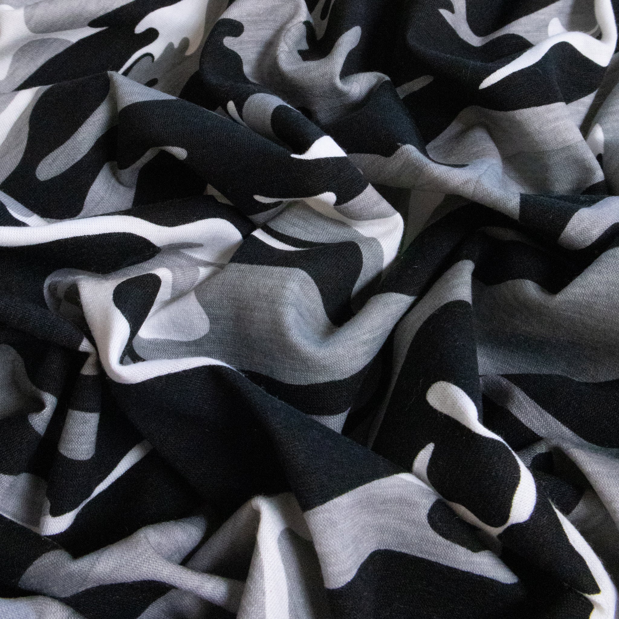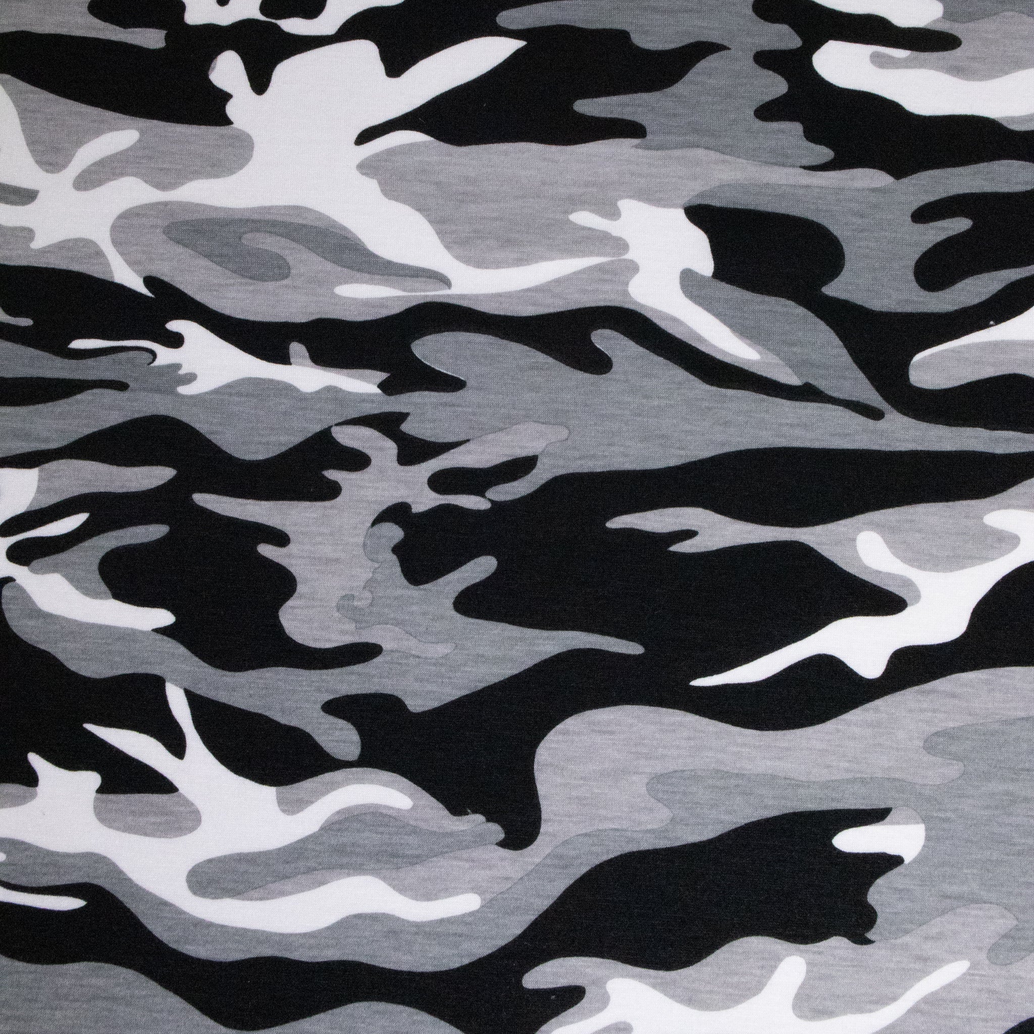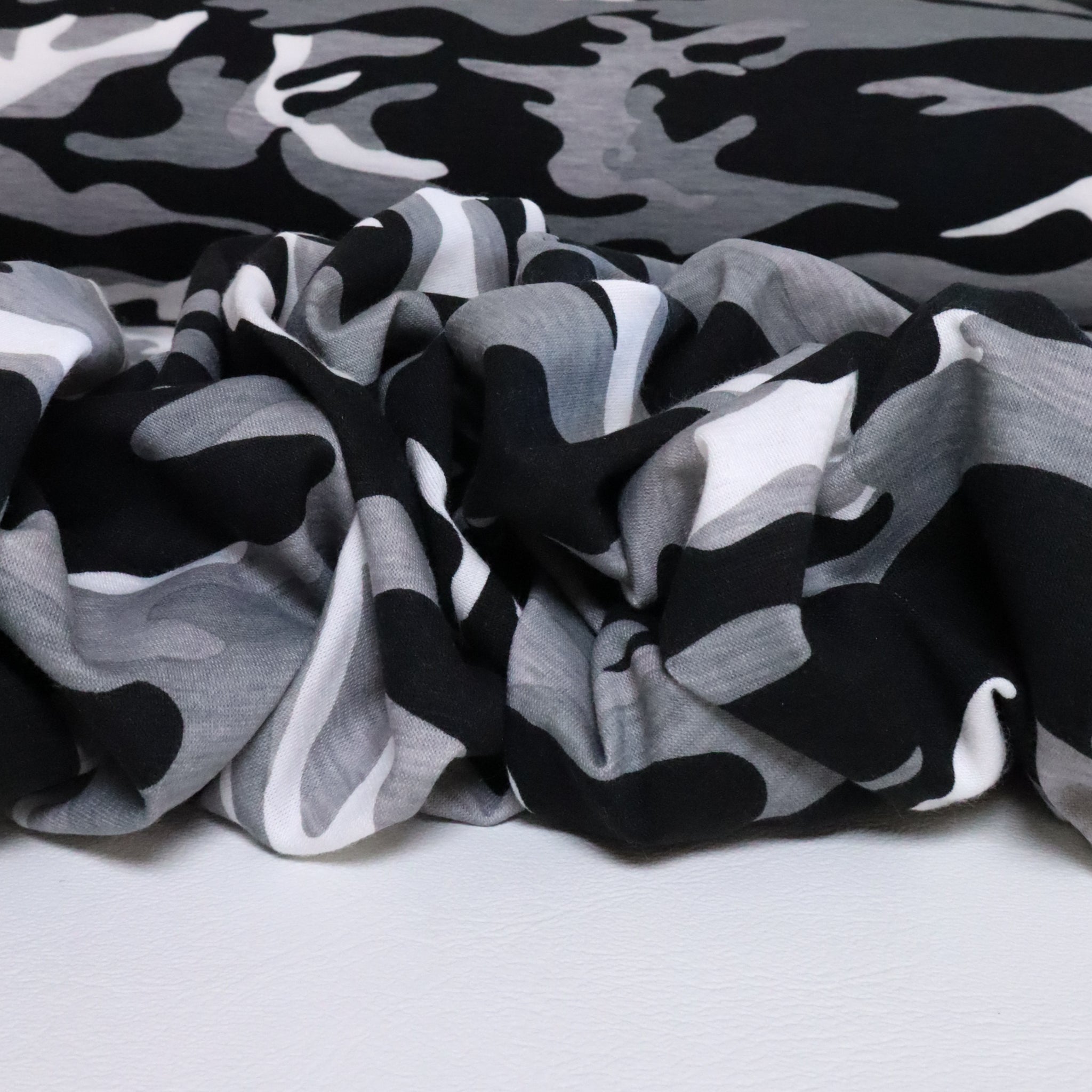 Cotton Camo T-Shirting Single Jersey – Black/White. A soft, pure cotton single jersey printed with a black-and-white camo design. Comfortable and breathable, this knit is ideal for t-shirts, casual dresses, loungewear, and pyjamas.