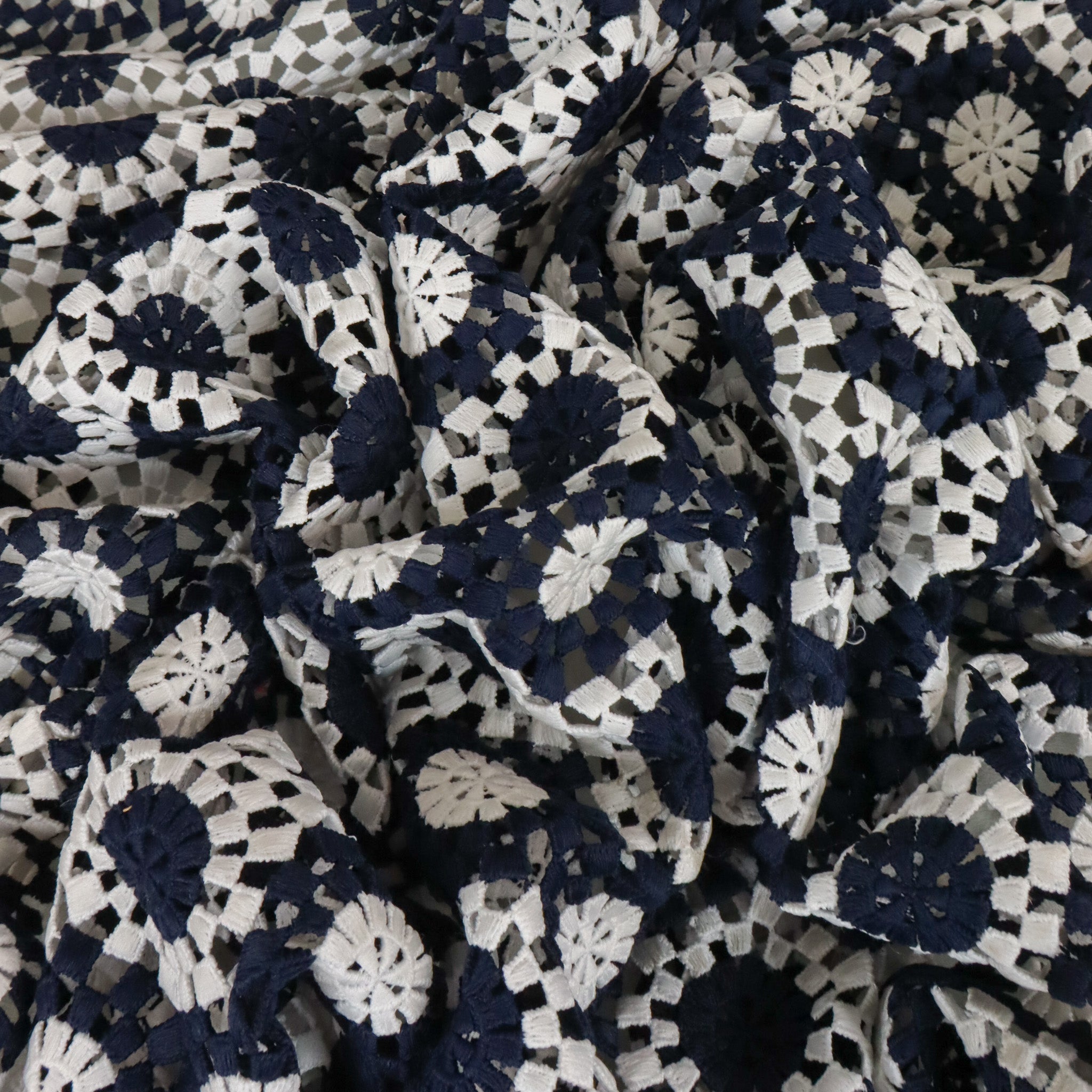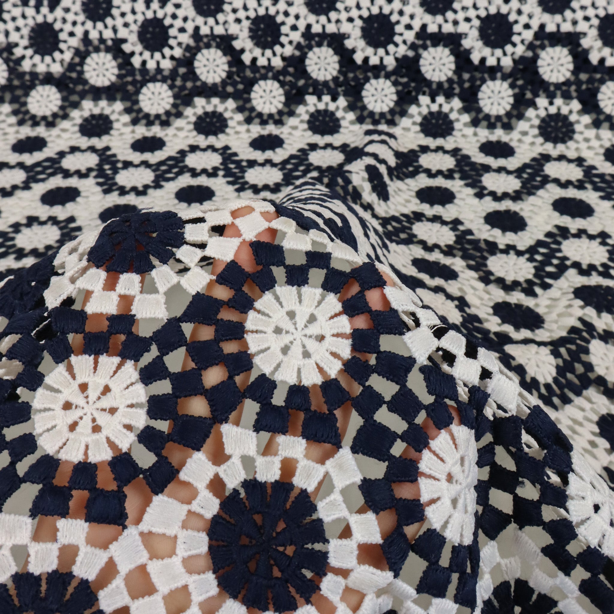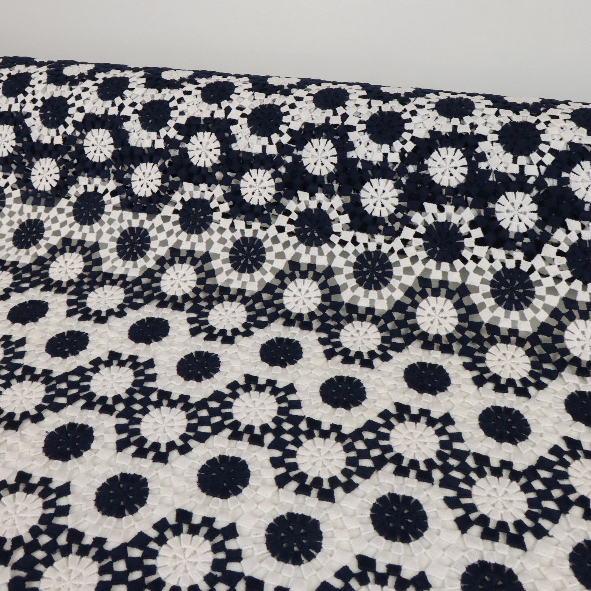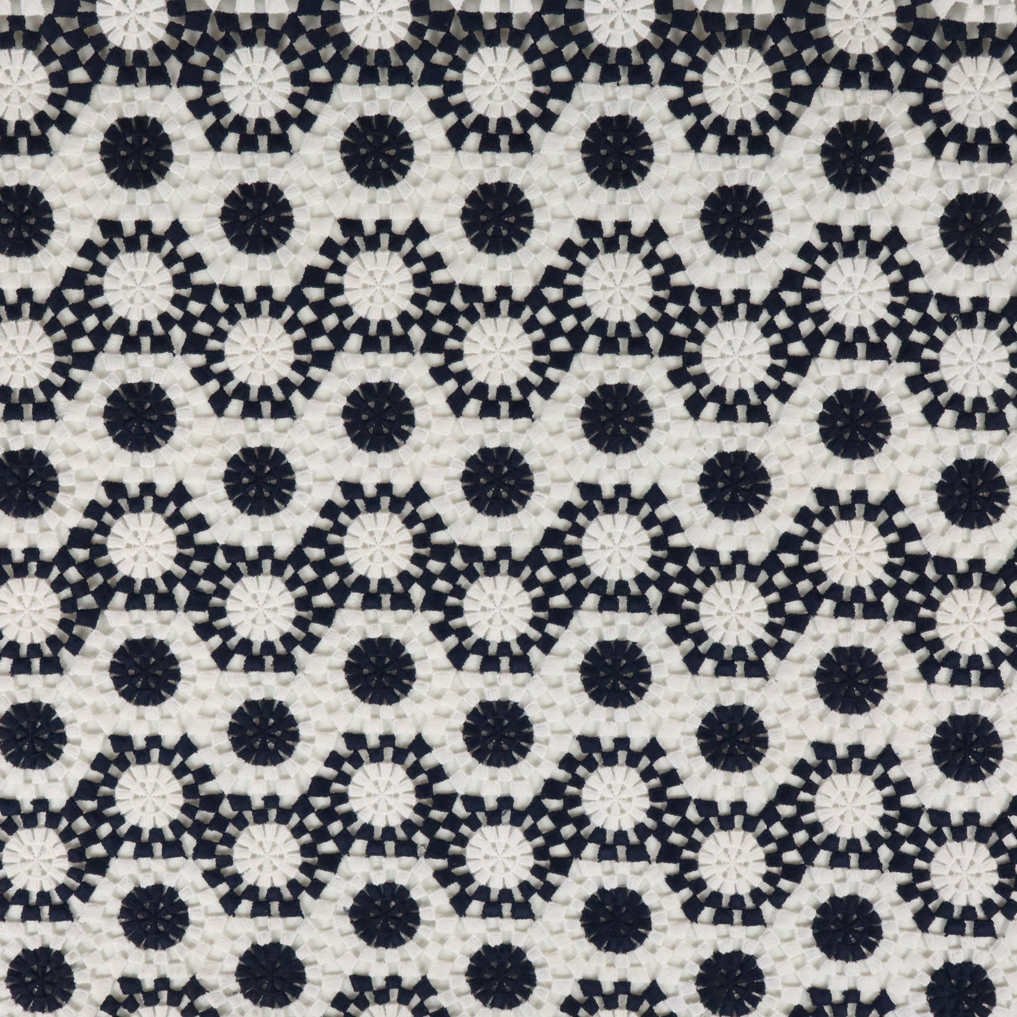 Geo Embroidered Lace Designer End – Madison Ink. A gorgeous guipure-style lace showcasing an intricate geometric design in classic ink and white tones. Sourced as a true designer end and available only in limited quantities.