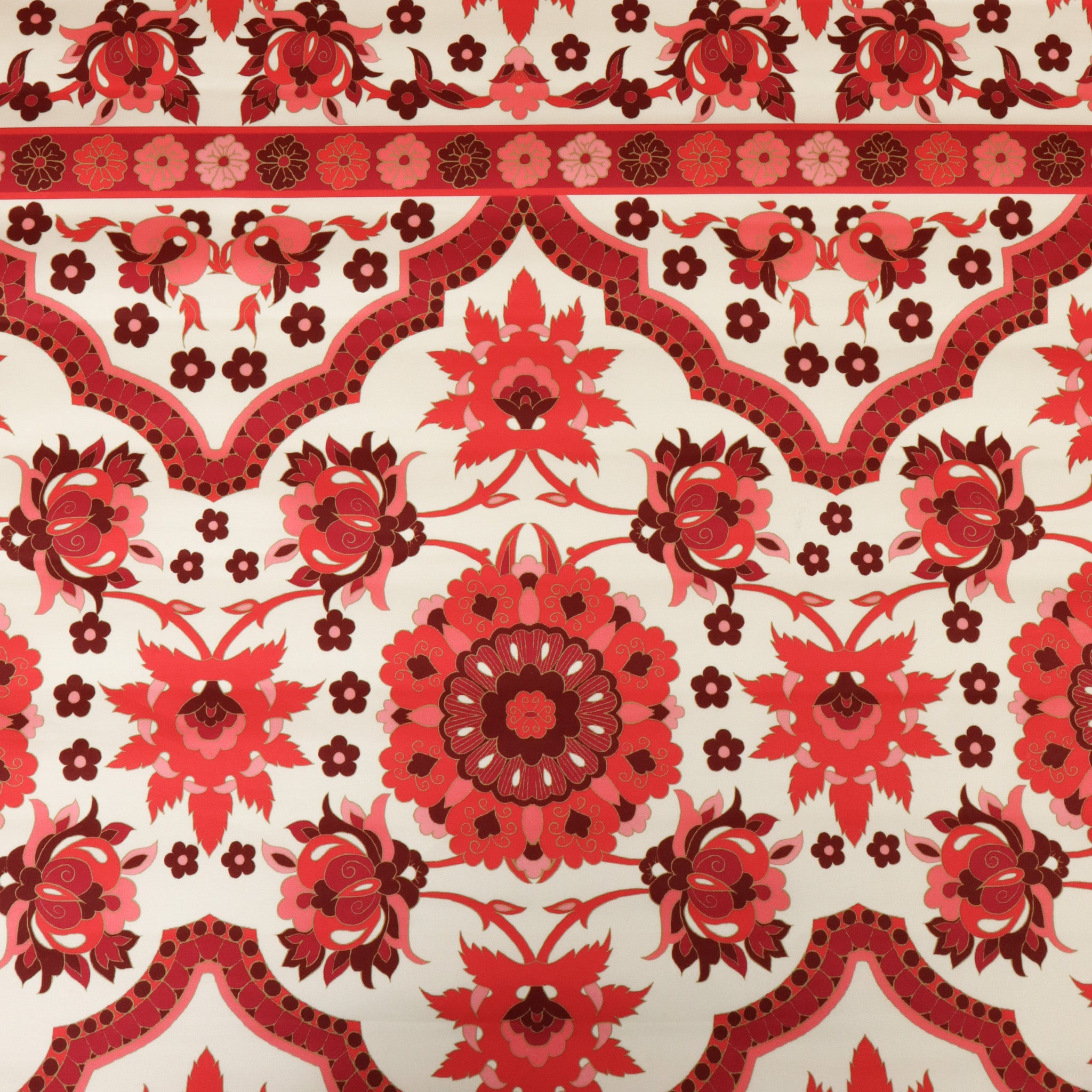 Floral Printed Cotton Sateen - Edwina. A luxurious floral cotton sateen in bold pink tones on a cream base.Woven in a classic sateen weave, it features a smooth, lustrous surface and soft hand feel, with just the right amount of stretch for ease. Durable yet elegant, this fabric is ideal for fitted trousers, dresses, skirts, and tailored separates. Sourced as a true designer end, available only in limited quantities.