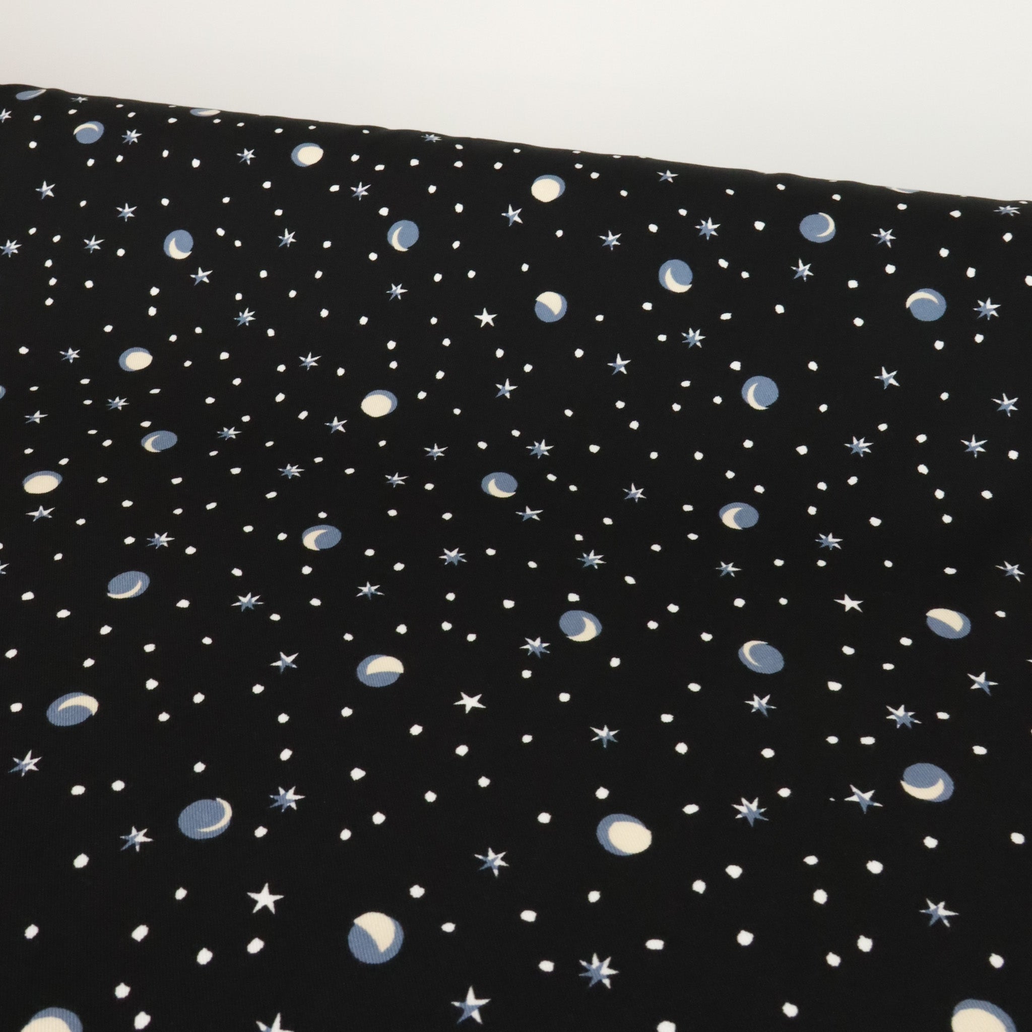 Rayon Nightside Print - Moons and Stars. A printed rayon woven with a soft hand feel and a lightly brushed right side, giving it a subtle warmth and texture. Perfect for dresses, shirts, shorts, or a matching top and pant set.