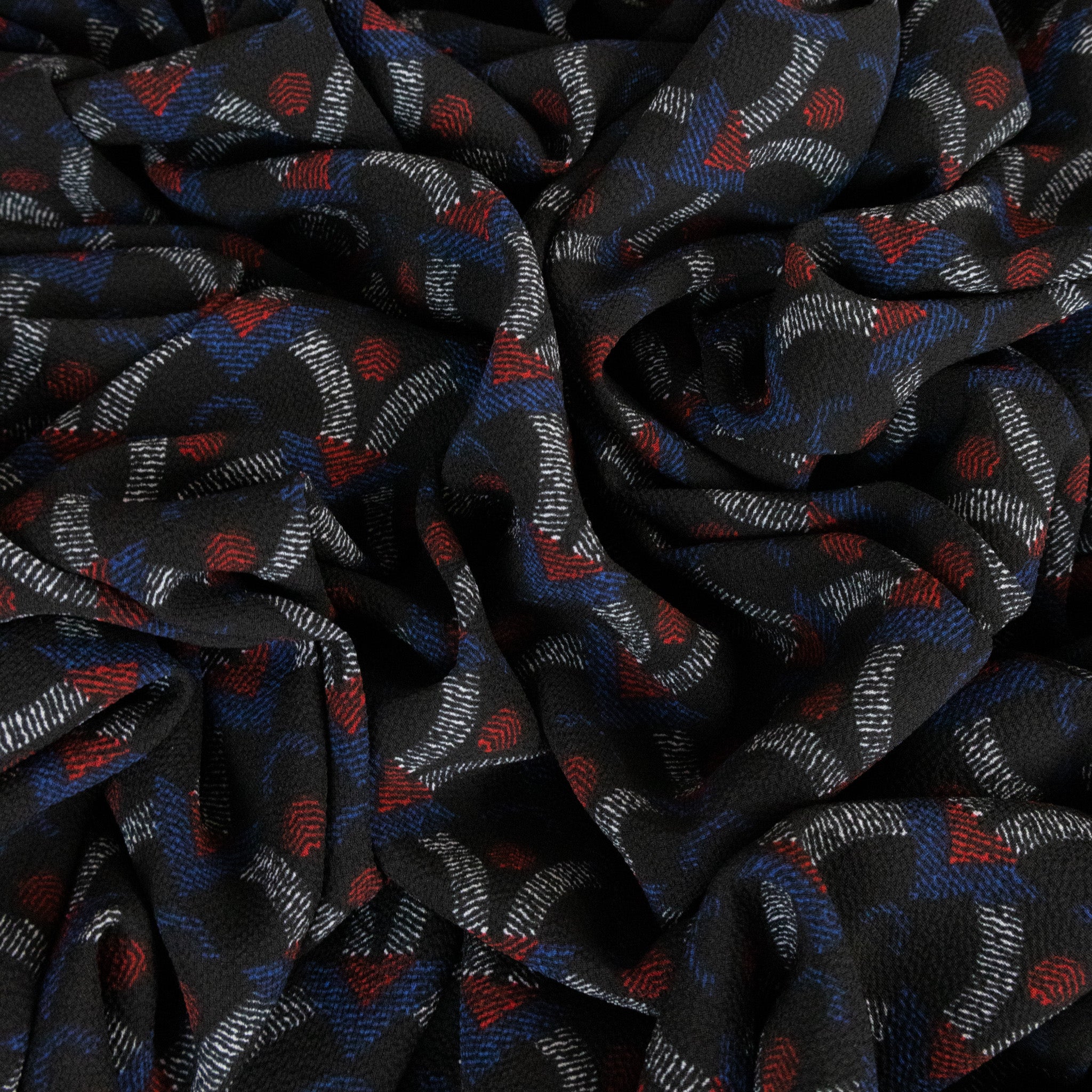 Textured Polyester Crepe Print - Morse Code. A midweight textured polyester crepe print with a soft, fluid drape. Featuring a subtle crepe surface texture, it’s perfect for blouses, floaty dresses, and easy layering pieces.