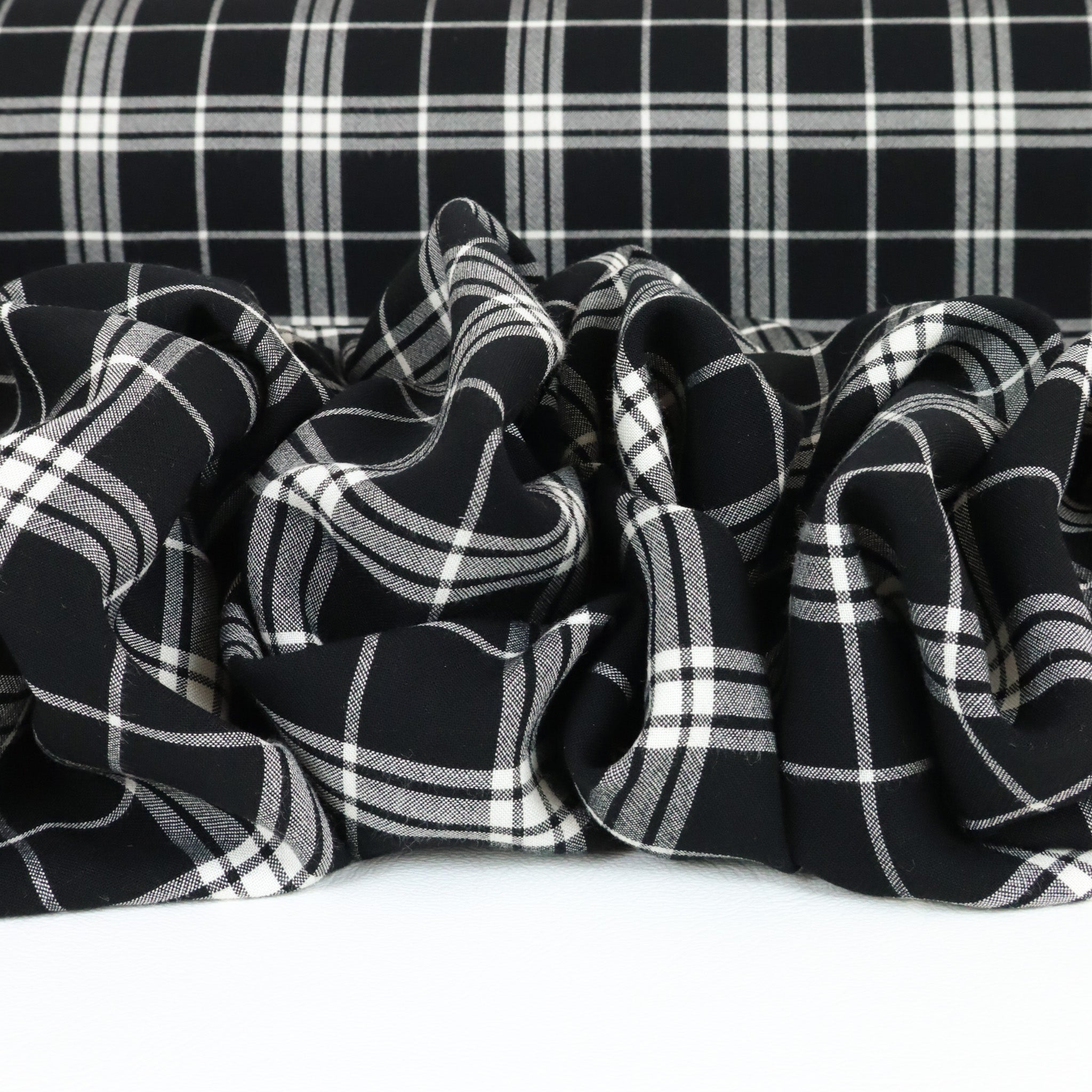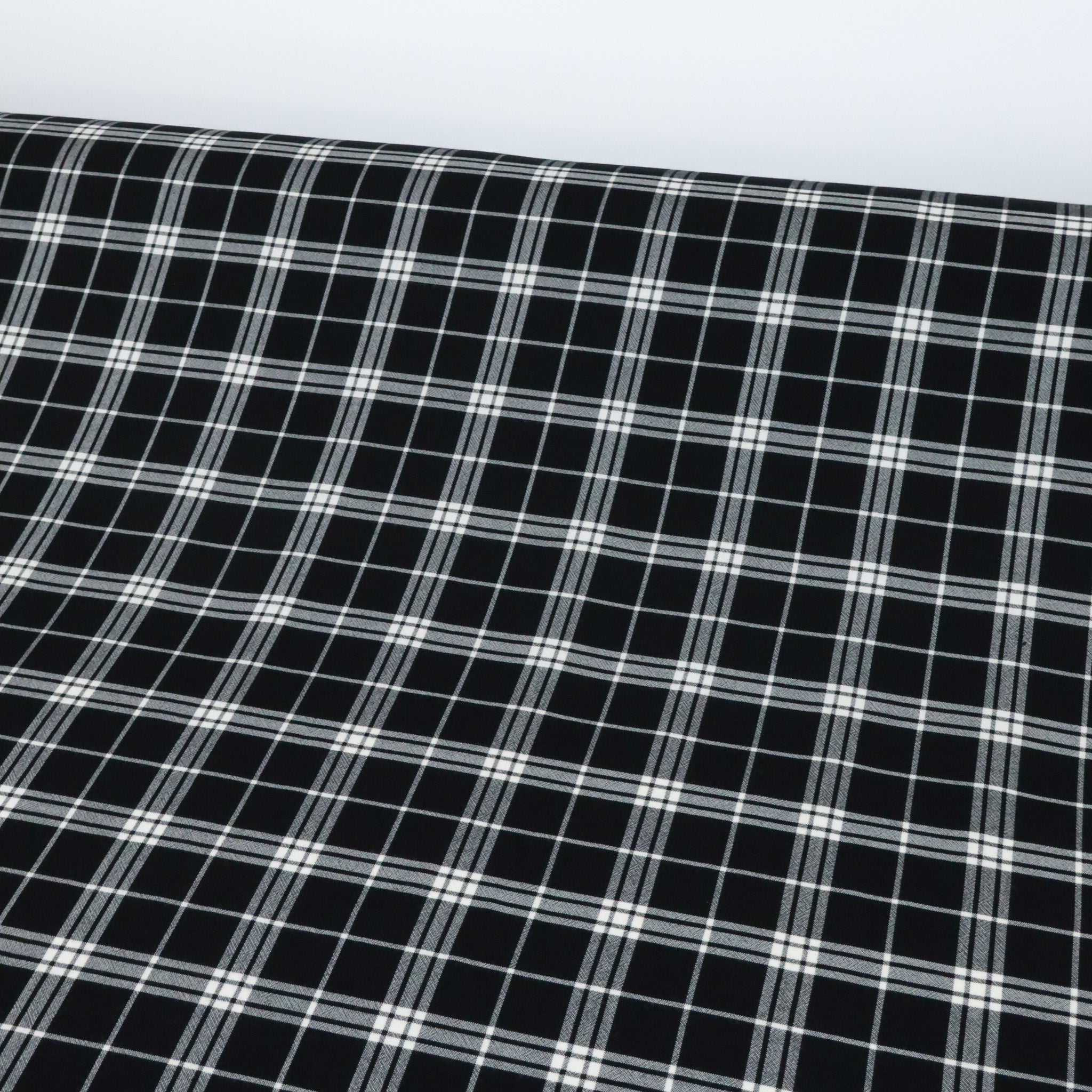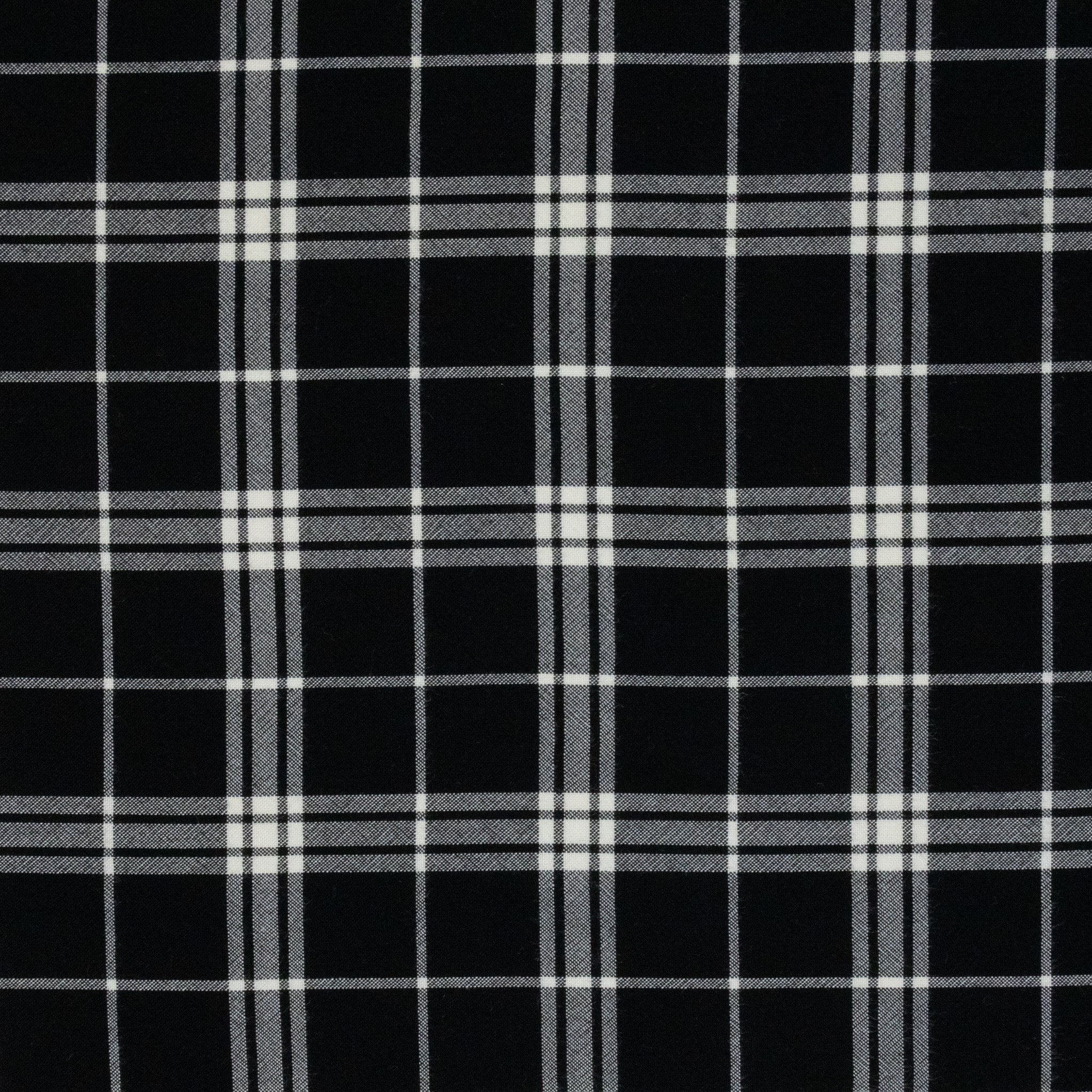 Viscose Crepe Windowpane Check in Black. A very fine viscose crepe in a black and white classic check pattern. Subtle texture with a fluid drape, viscose is breathable and easy to wear, making this fabric ideal for dresses, blouses, and skirts. Sourced as a true designer end, available only in limited quantities.