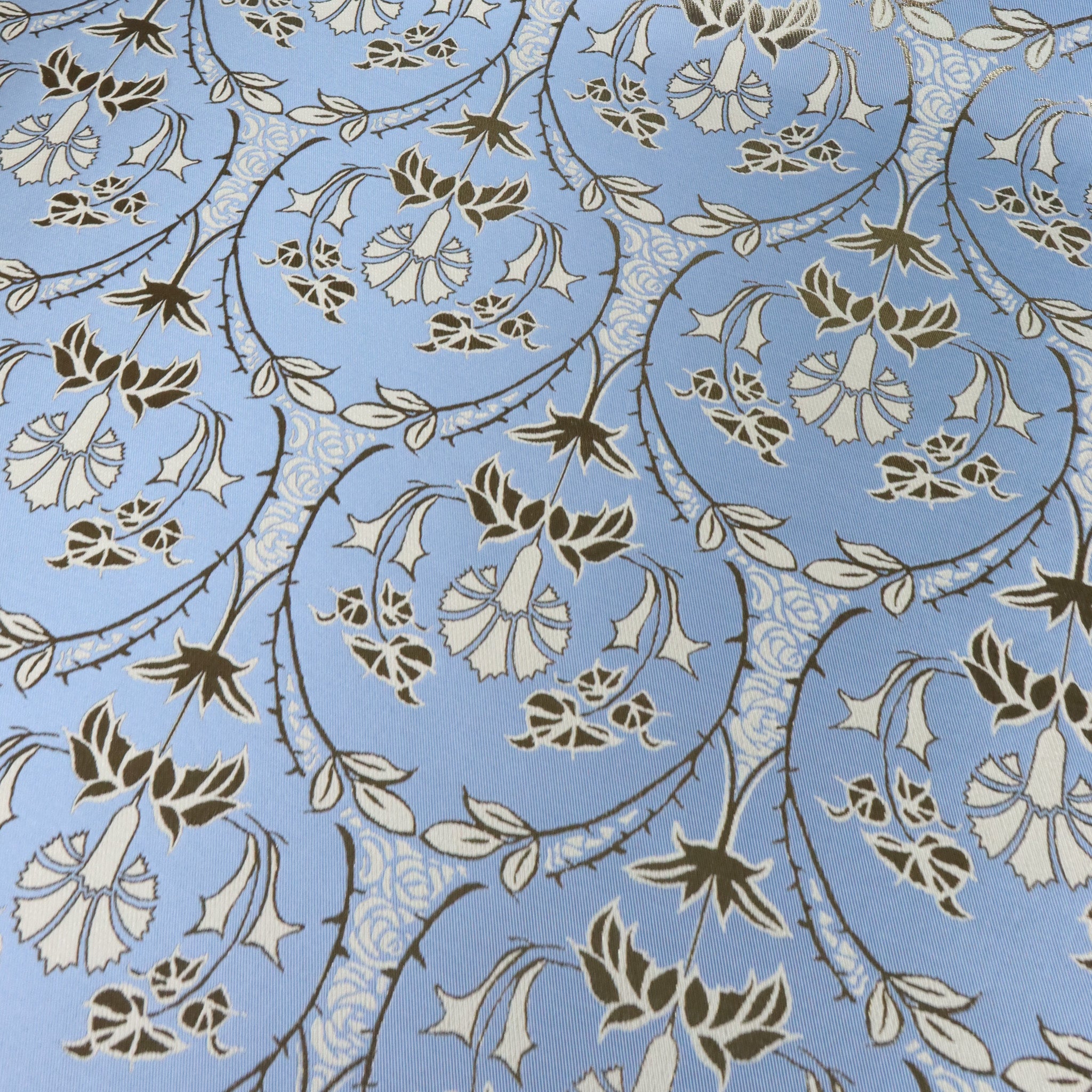 Viscose Luxe Jacquard Gala in Wedgewood. A richly textured heavy viscose jacquard in Wedgewood blue, woven with shimmering gold lurex thread for a touch of opulence. With a structured hand and luxurious weight, this fabric holds its shape beautifully, making it ideal for tailored jackets, evening coats, cocktail dresses, and statement skirts. Sourced as a true designer end, available only in limited quantities.